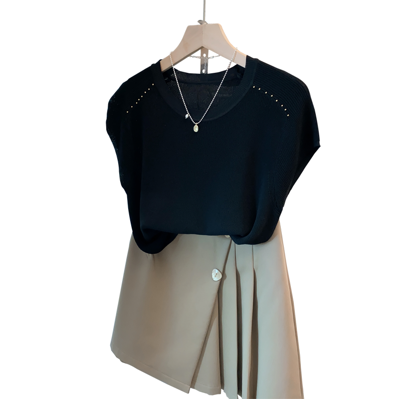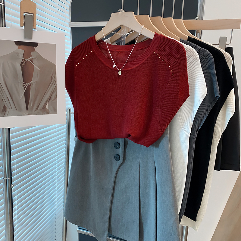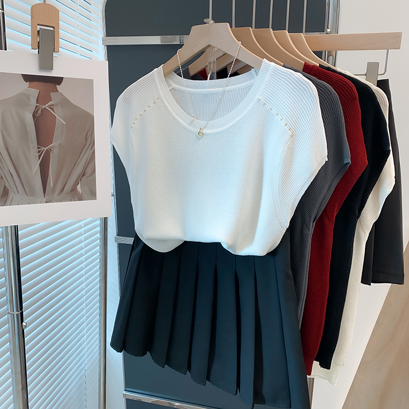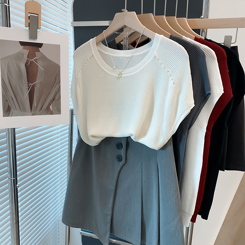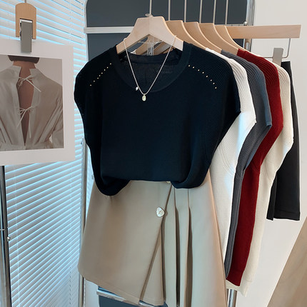钉珠飞飞袖冰丝针织衫女薄t恤衫
