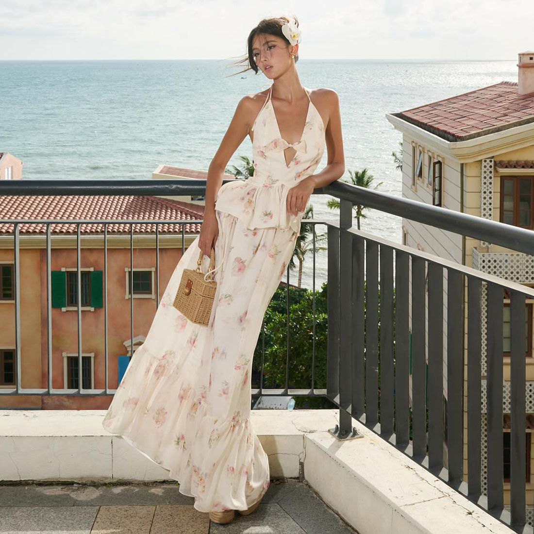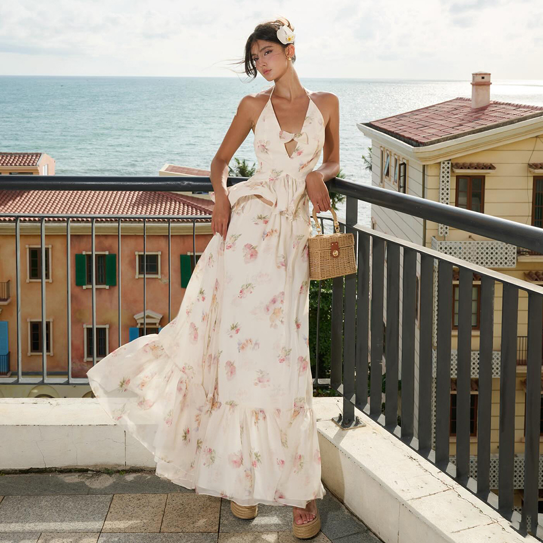 碎花蝴蝶结吊带荷叶边长裙套装女