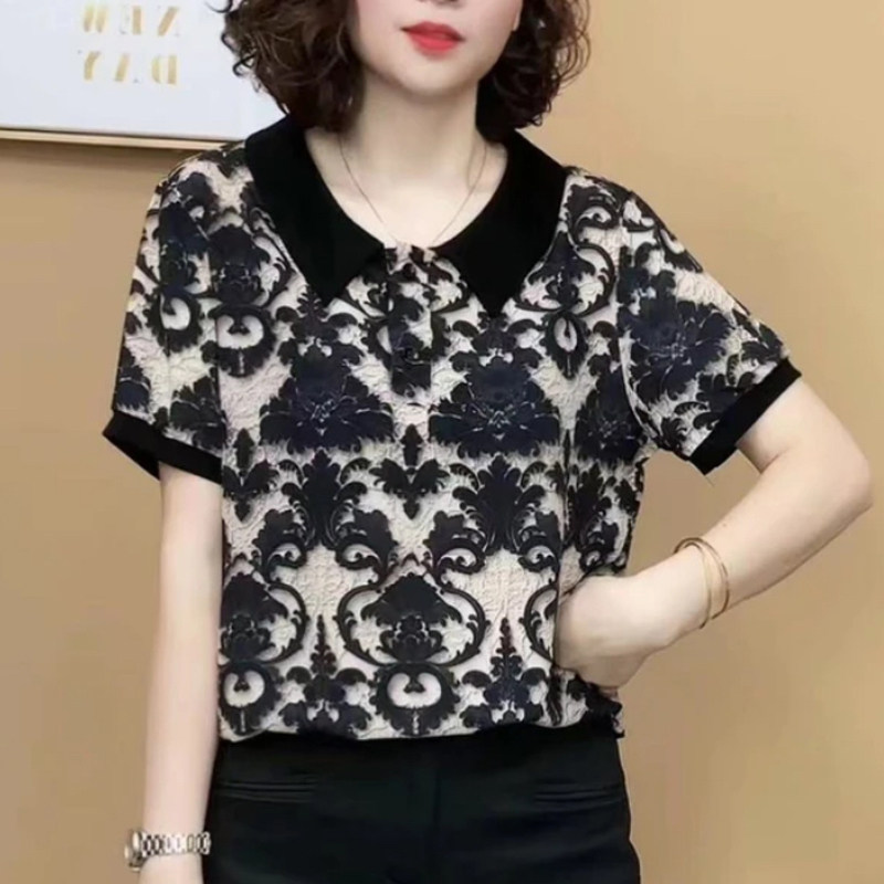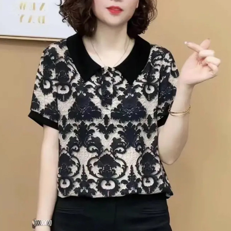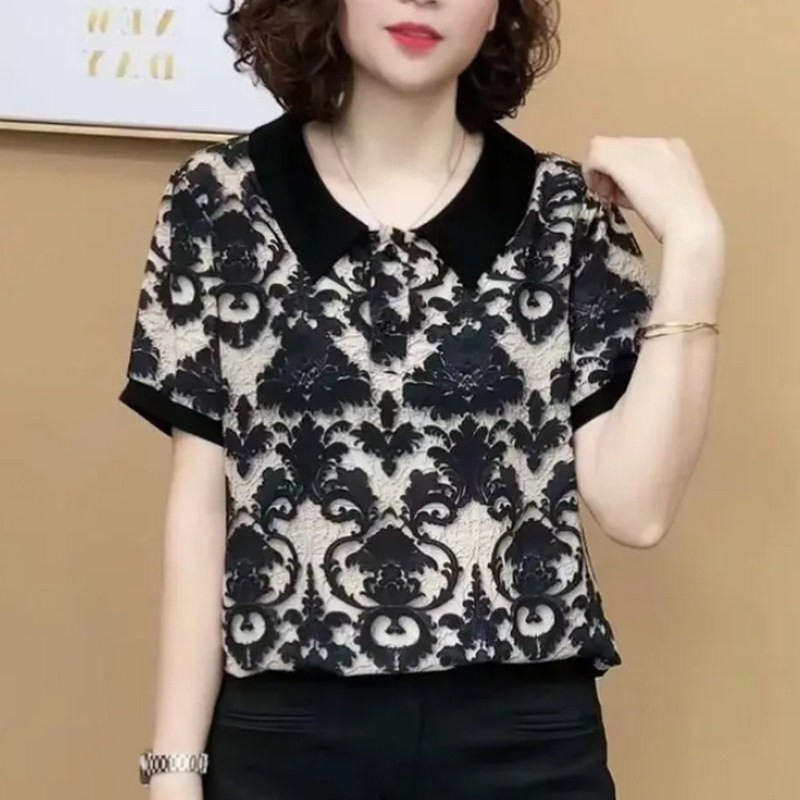 妈妈装娃娃领洋气雪纺印花小衫时尚女夏季短袖T恤减龄百搭女上衣