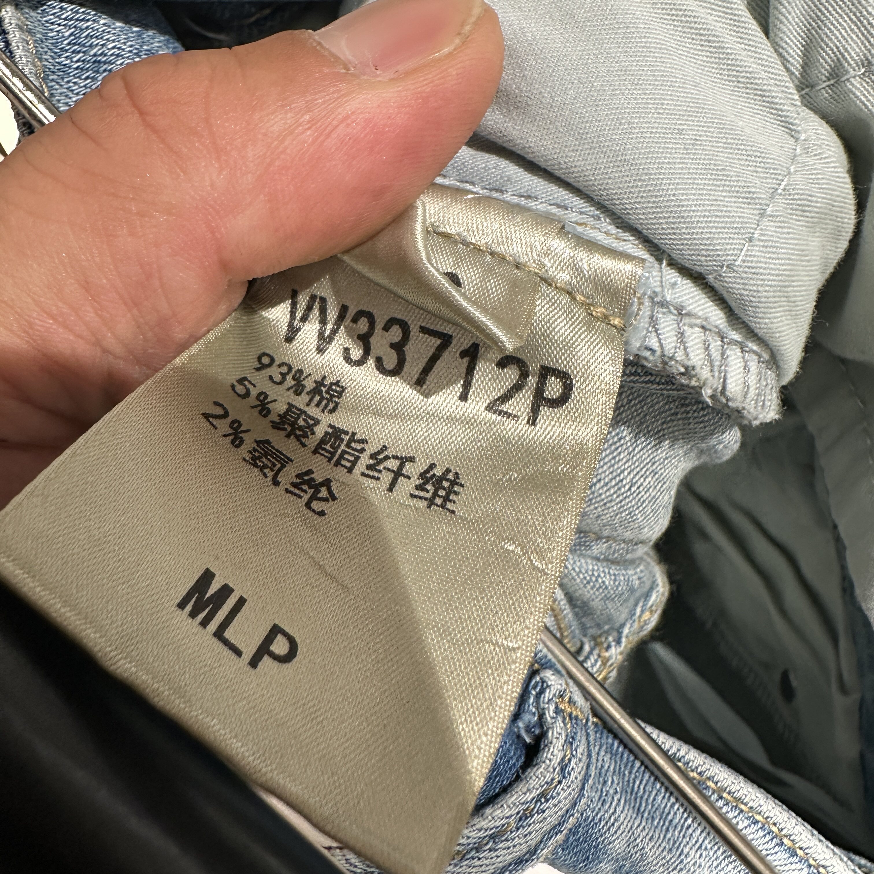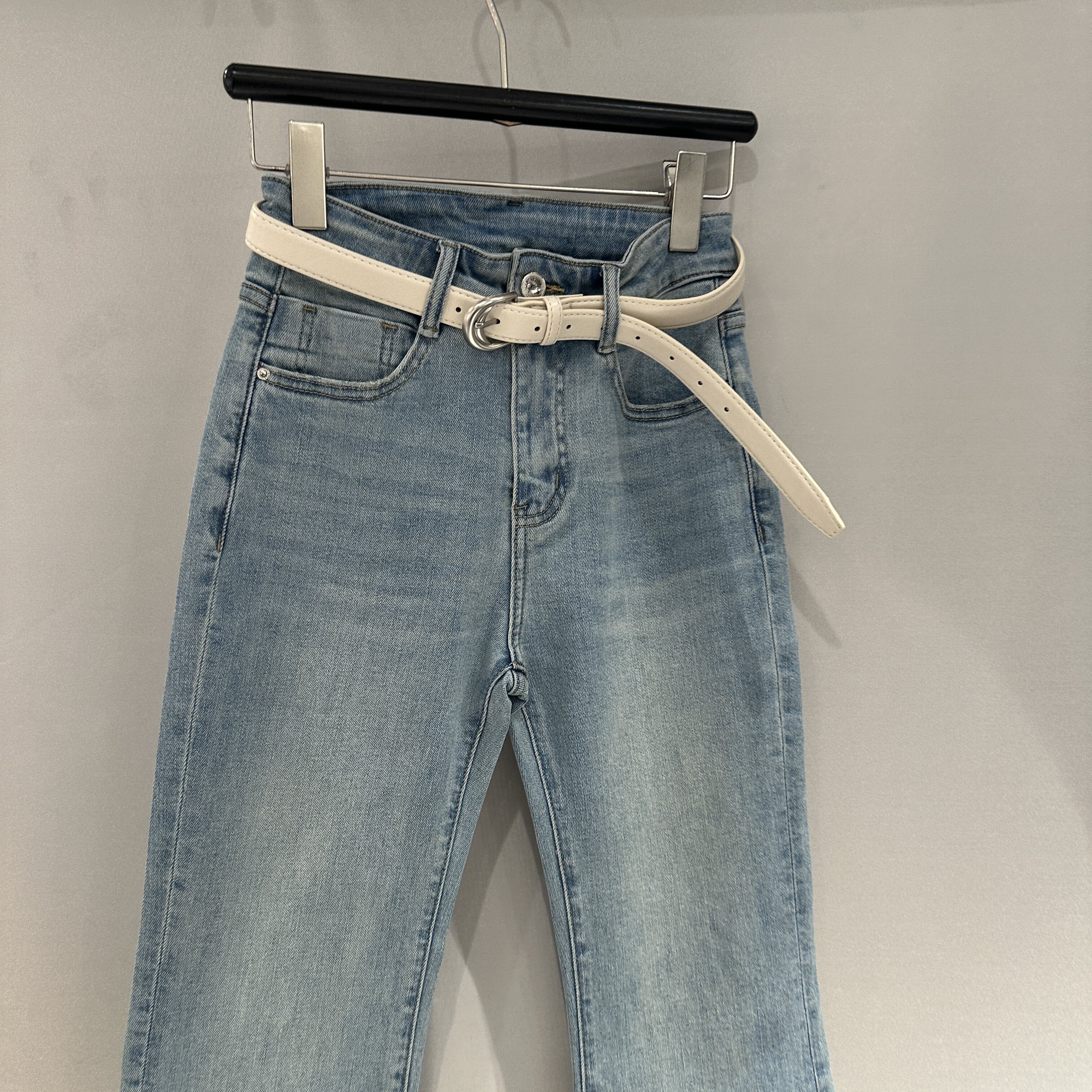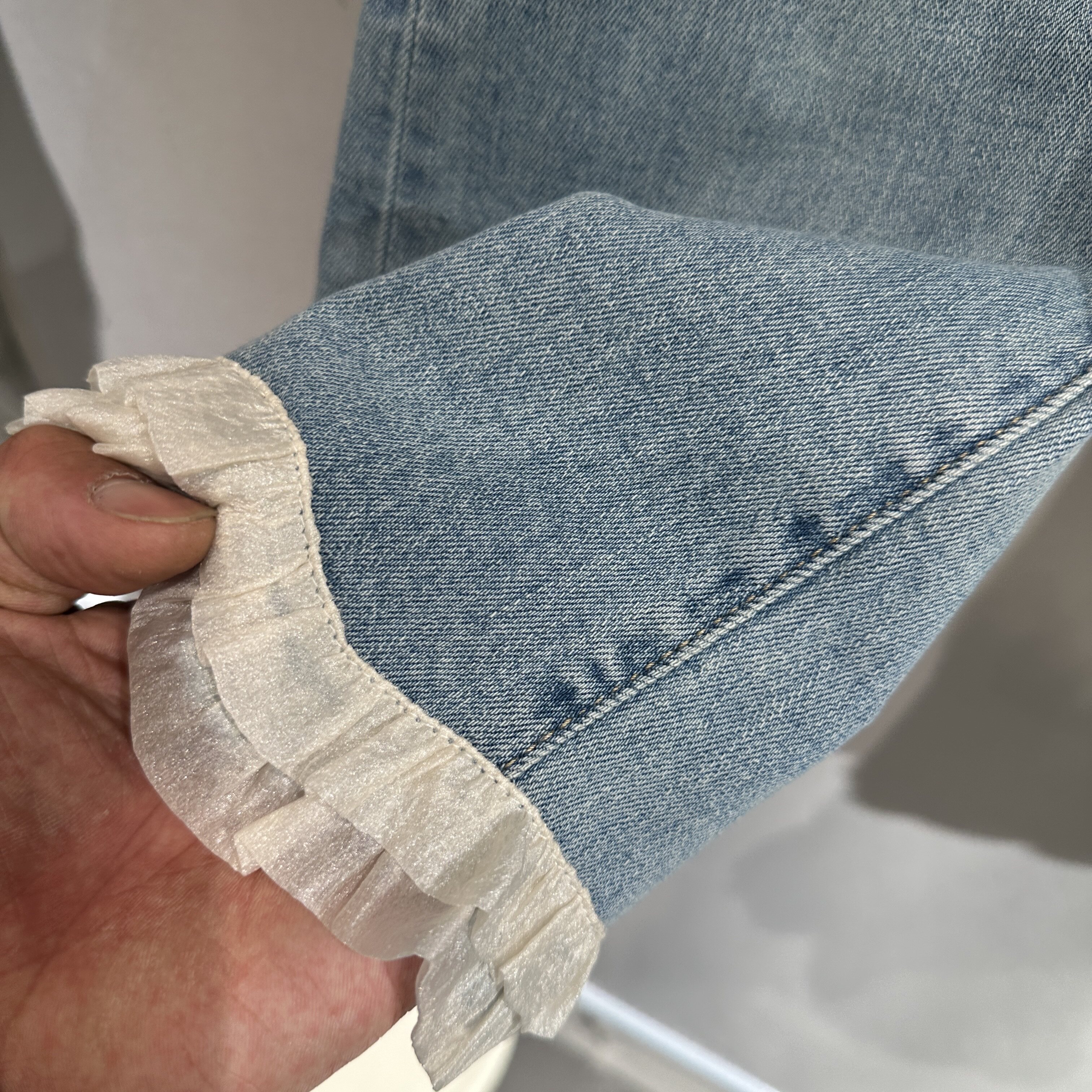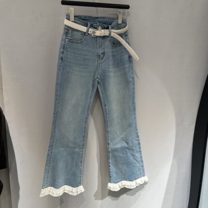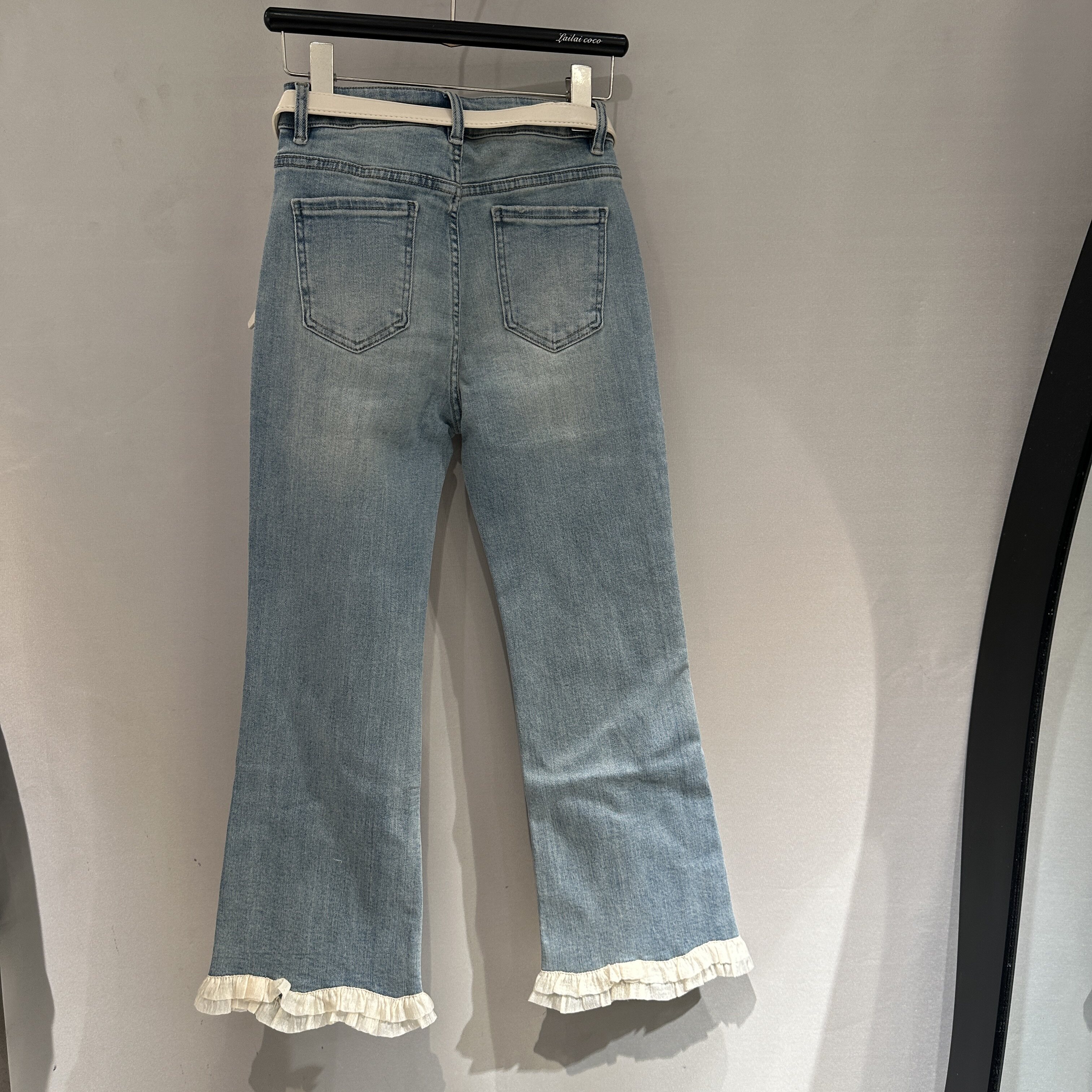 欧洲站2026春季新款裤脚压褶花边修身显瘦腰带款牛仔微喇裤W33712