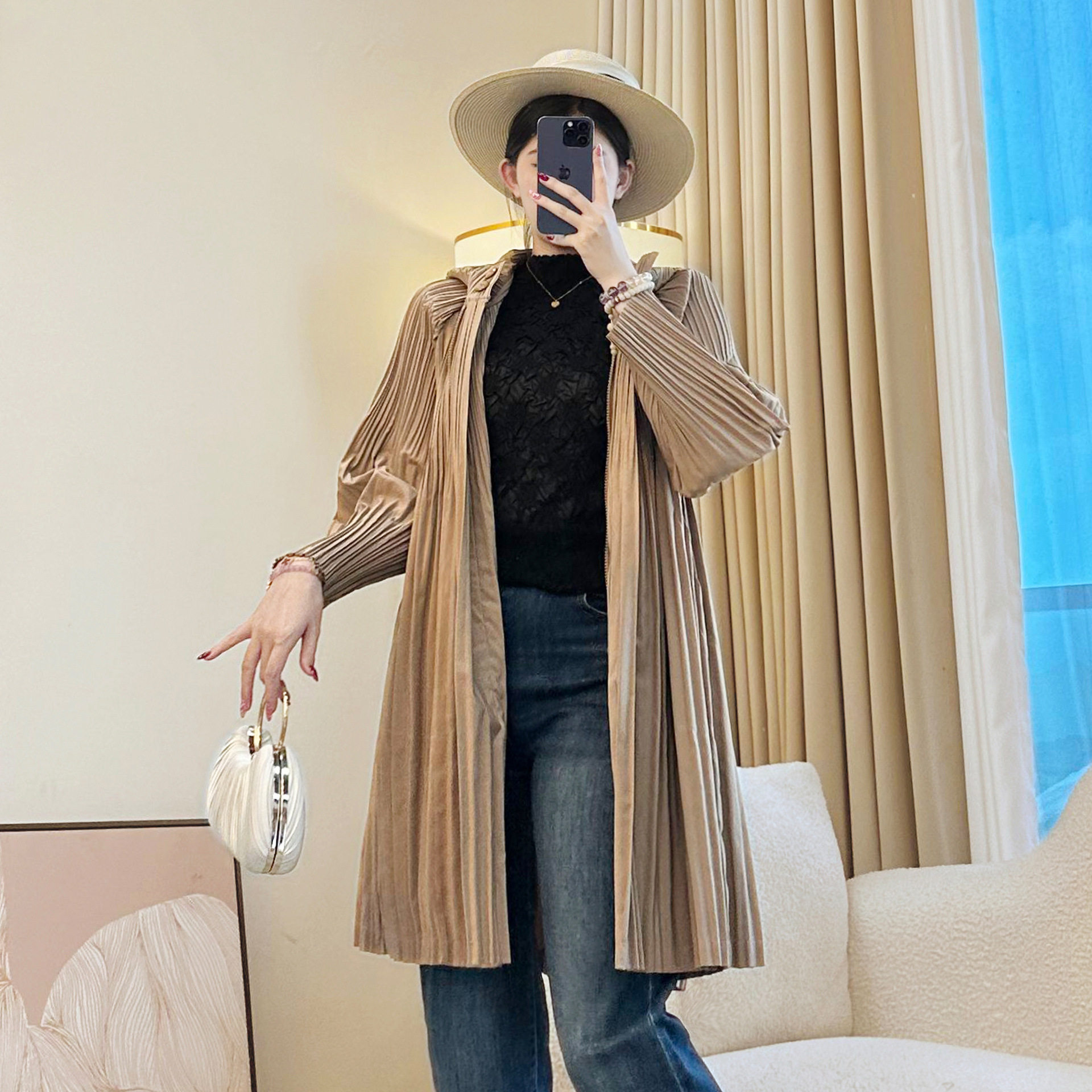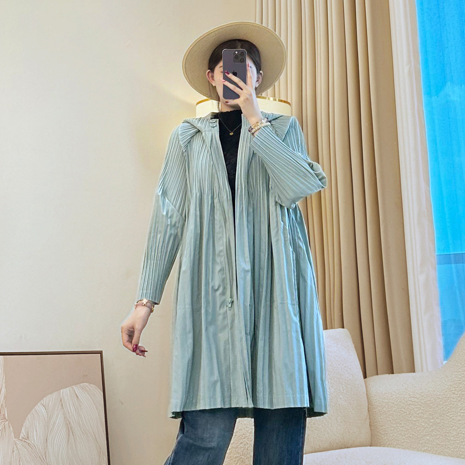 褶皱风衣短款外套灯笼袖涤纶