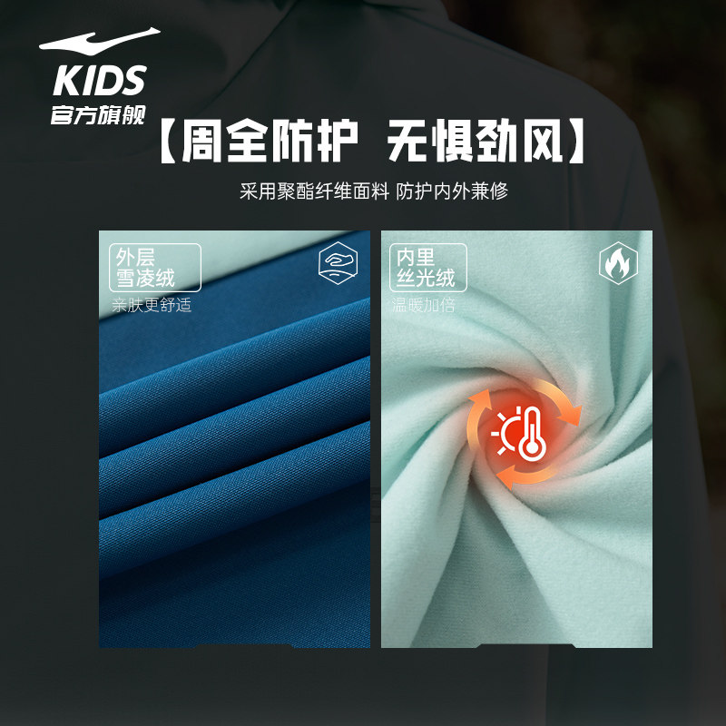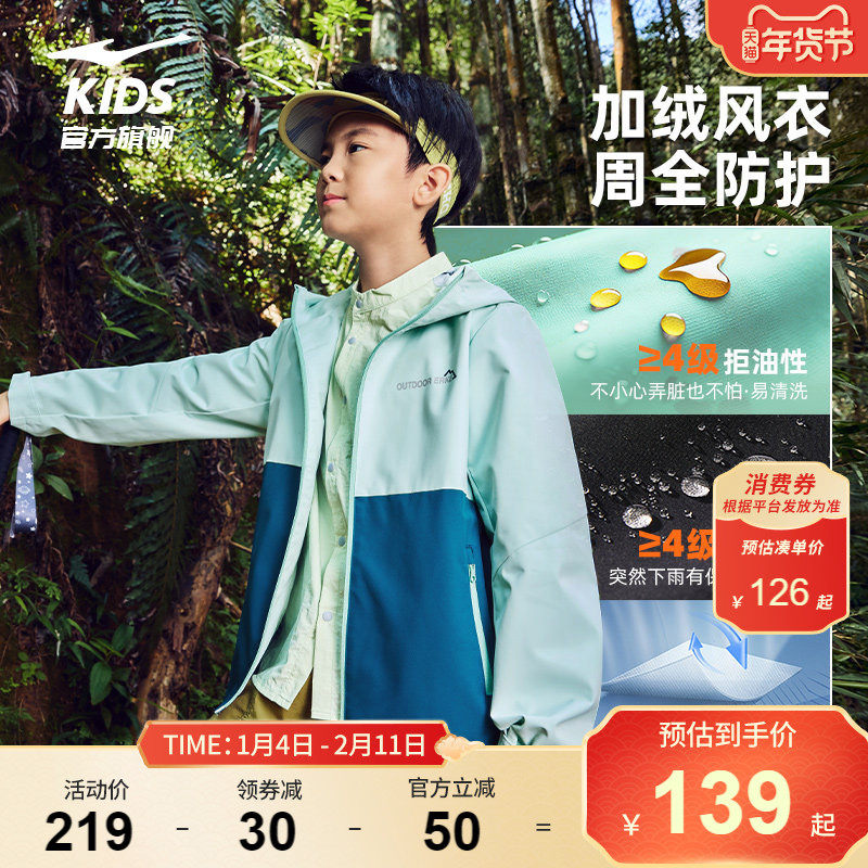 鸿星尔克童装男童秋冬加绒加厚冲锋外套儿童风衣大童女童户外上衣
