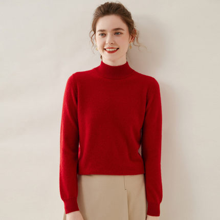 鄂尔多斯市产半高领100%纯羊毛衫女内搭毛衣宽松针织衫打底羊绒衫