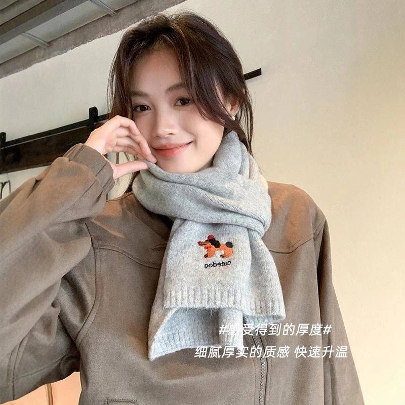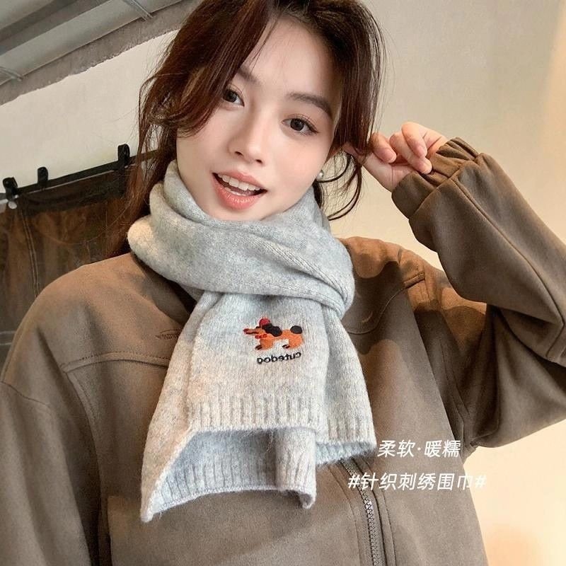 韩系氛围感小狗刺绣含羊绒围巾女2025新款秋冬季保暖针织毛线围脖