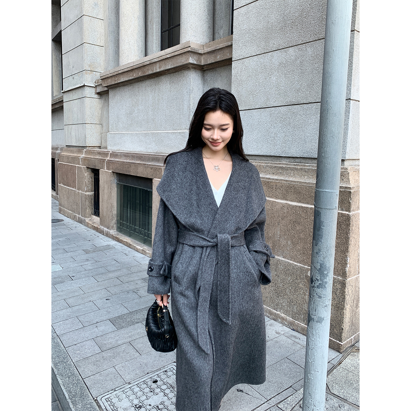 AAU Store大翻领澳洲羊毛双面呢大衣女冬季加厚系带毛呢外套女
