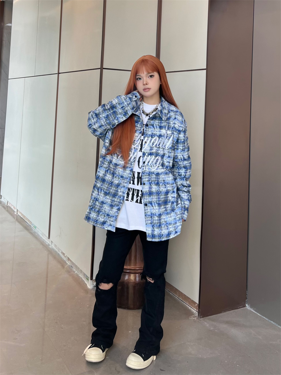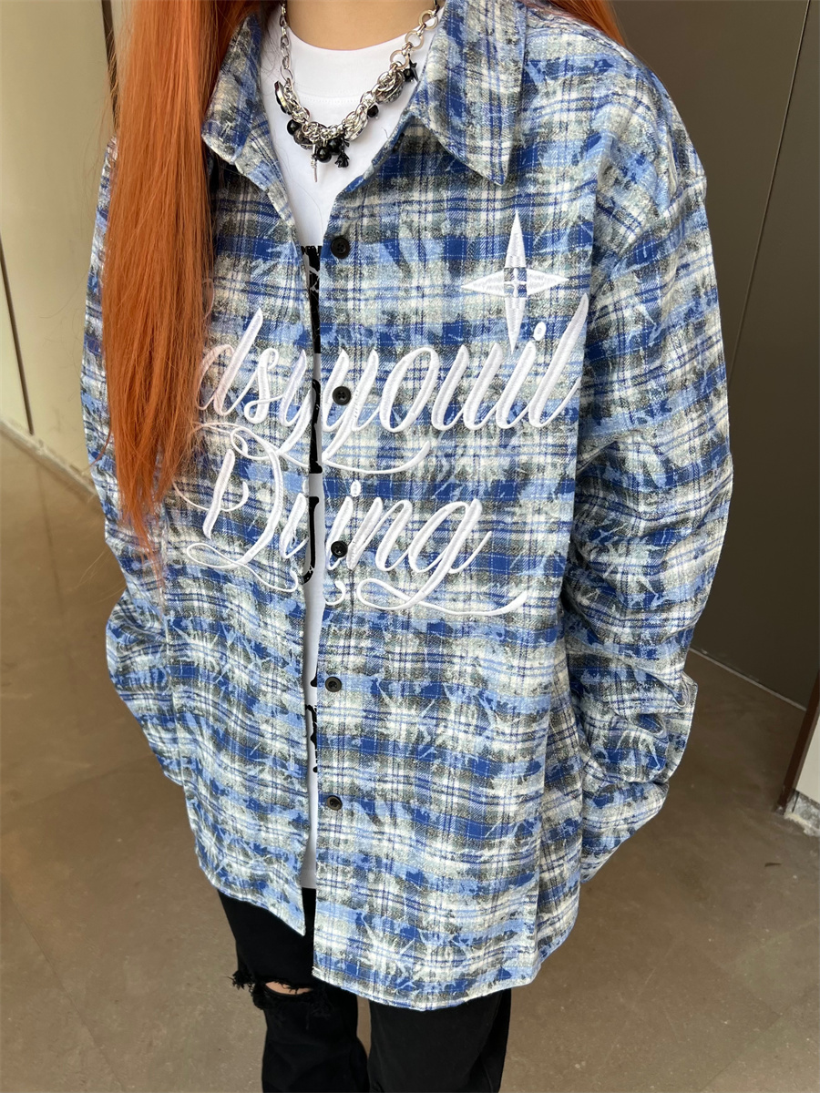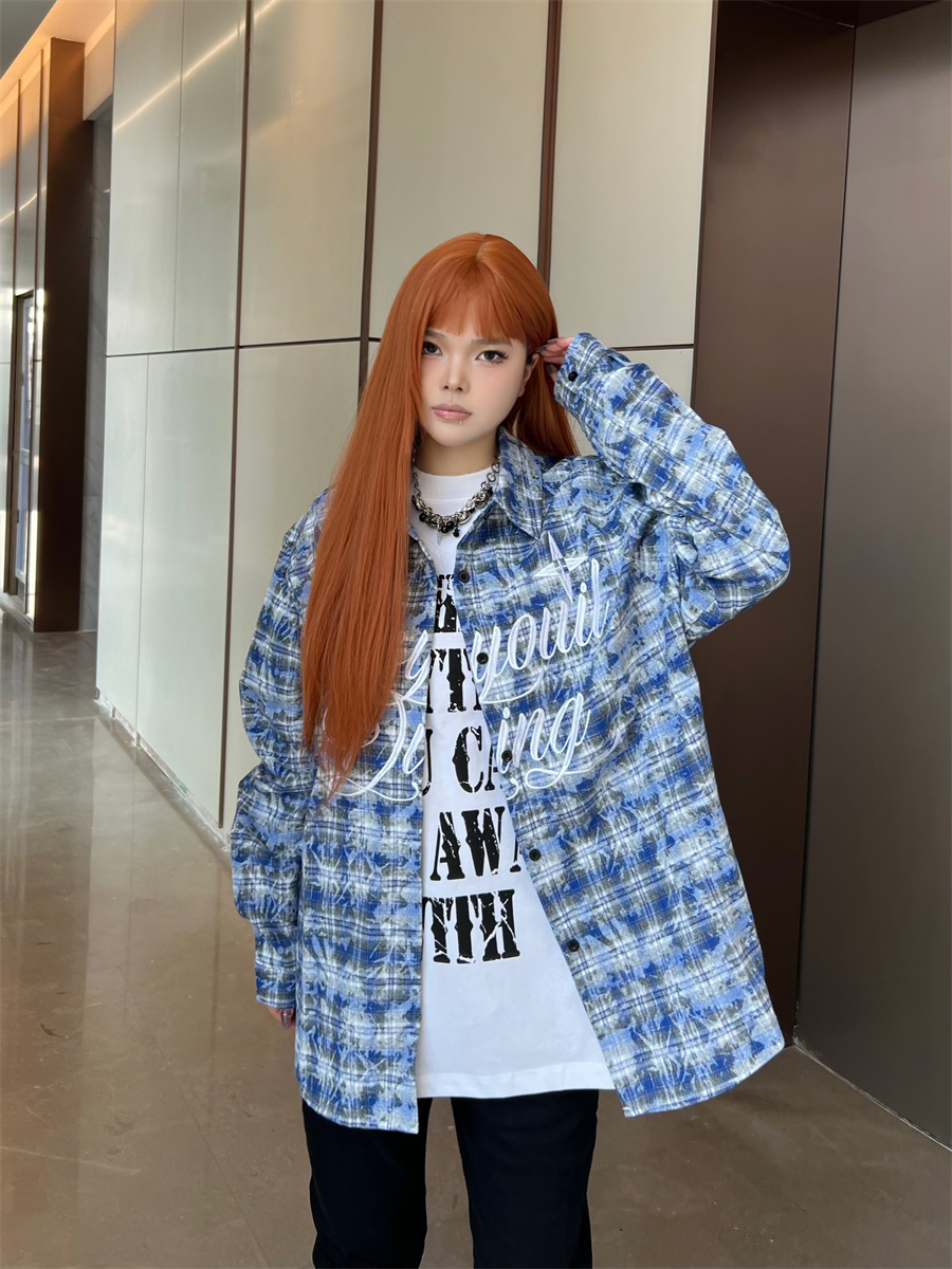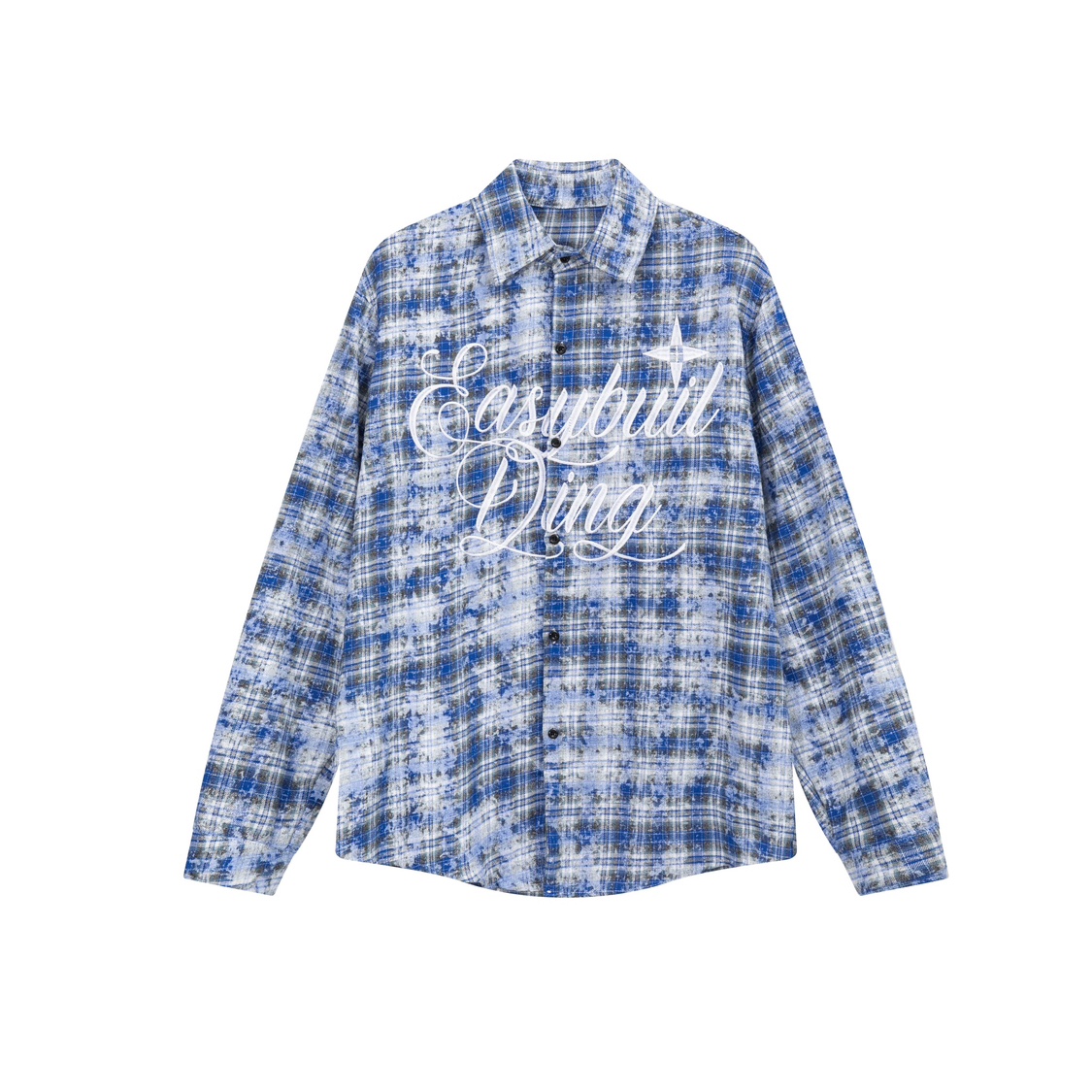 KKTD 扎染美式原创蓝色格子衬衫外套男女宽松潮流长袖休闲上衣