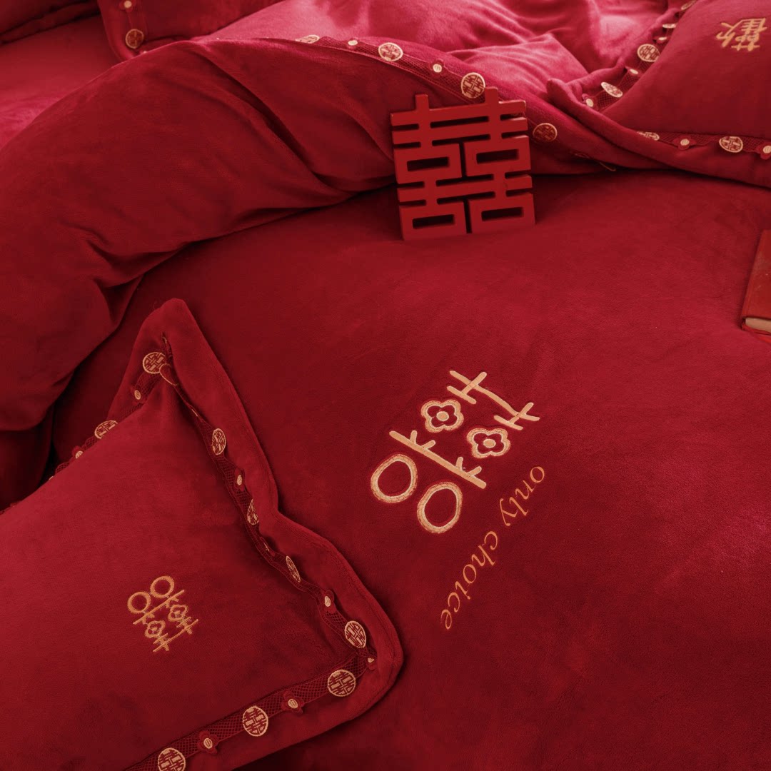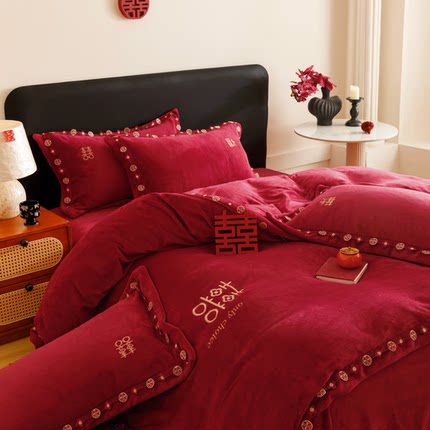 婚庆冬季加厚牛奶绒四件套喜字刺绣防静电珊瑚绒被套床笠陪嫁床品