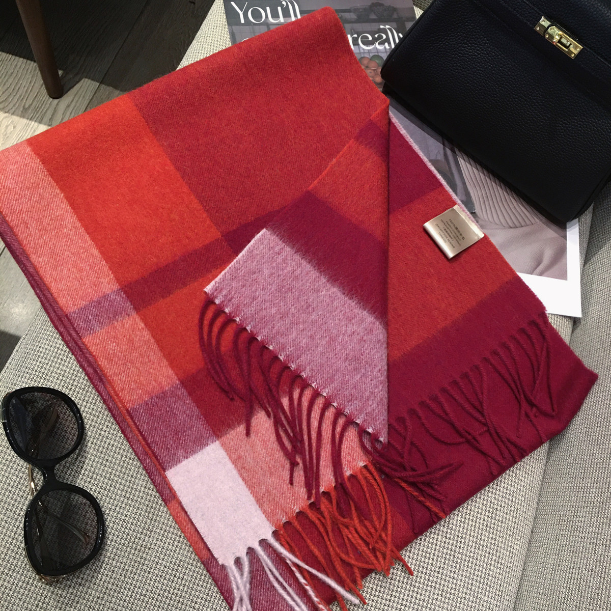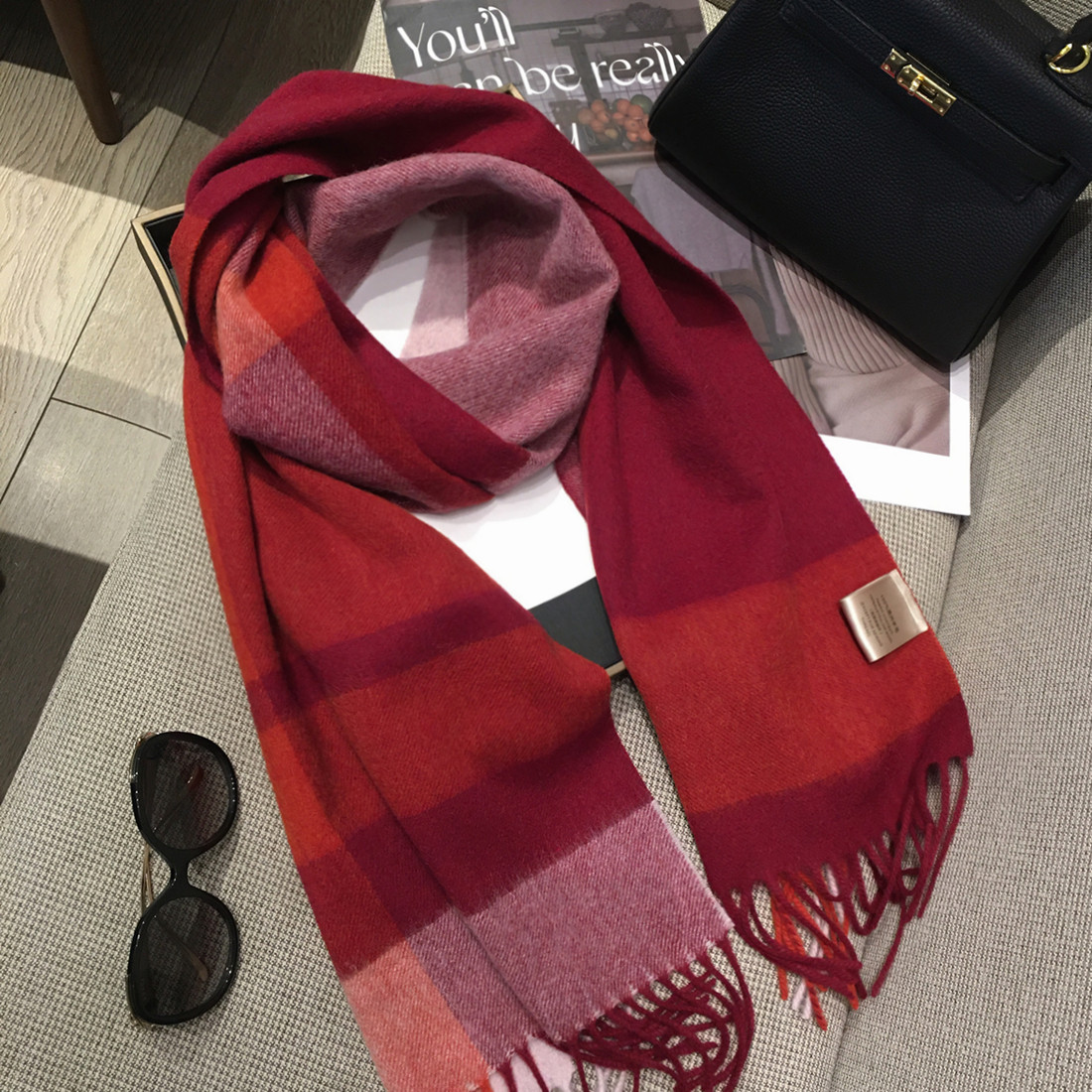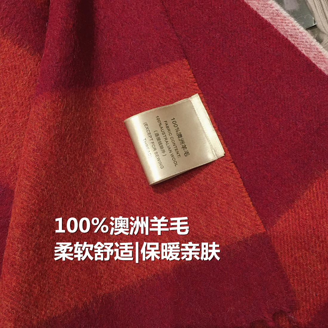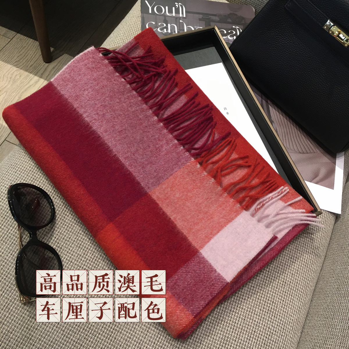 高档100%澳洲羊毛围巾女车厘子红格子纯羊绒披肩两用保暖长款围脖