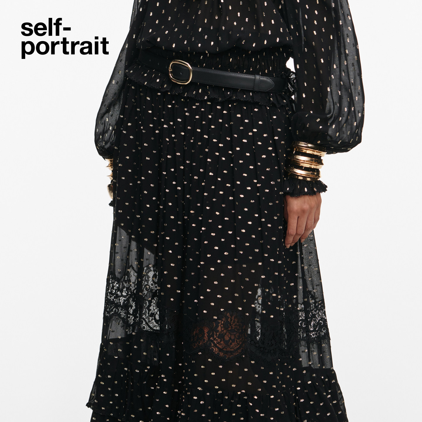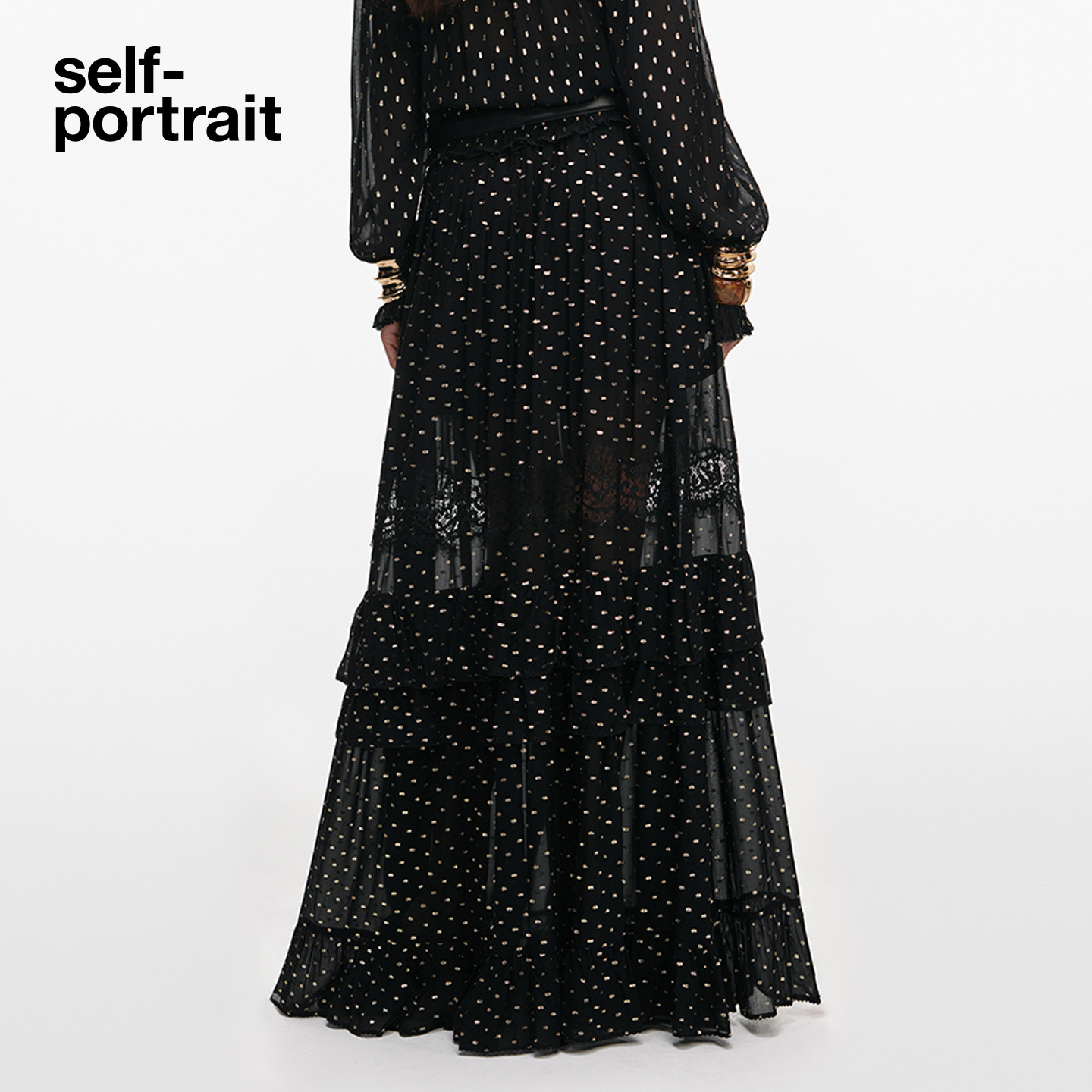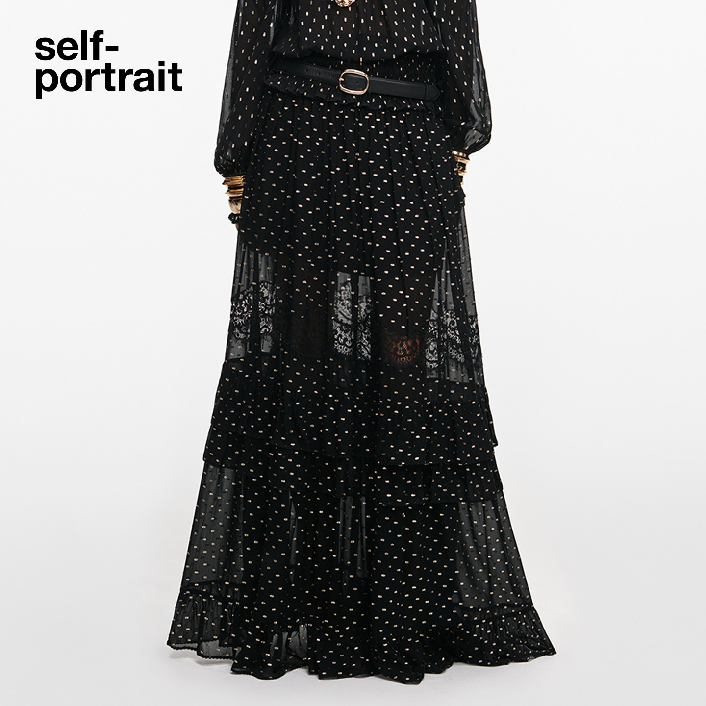 self-portrait 2026早春新款经典黑金色波点雪纺蕾丝半身裙中长裙