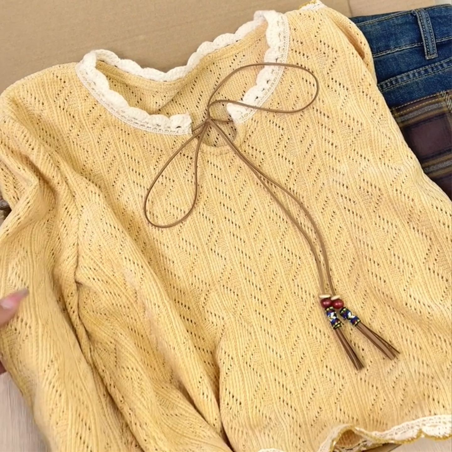 韩系甜美黄色蕾丝花边长袖针织衫女秋季新款漂亮内搭打底衫小上衣