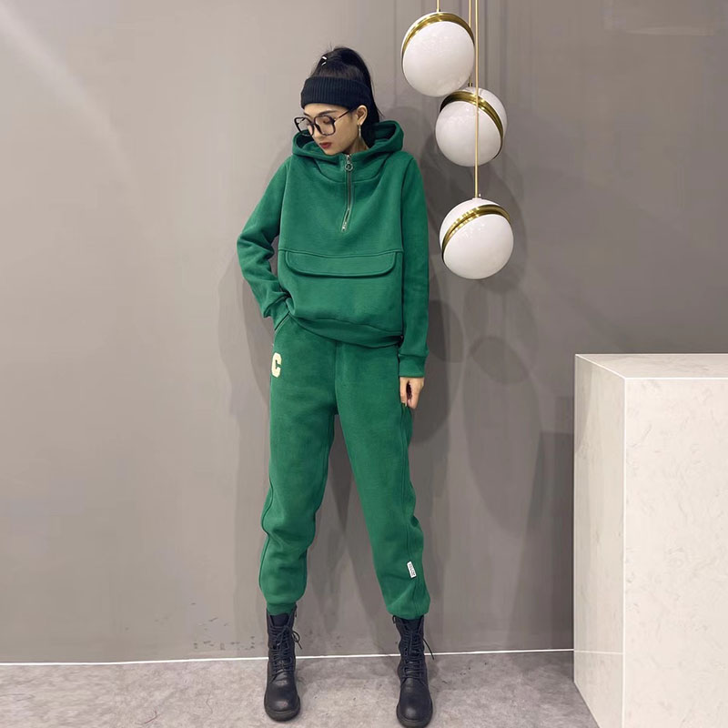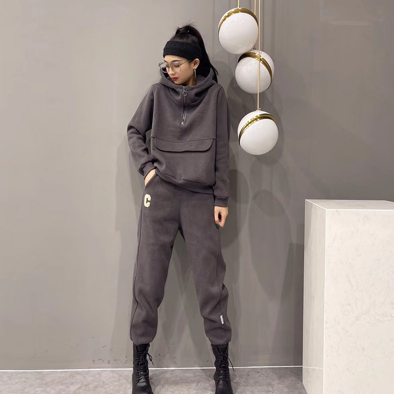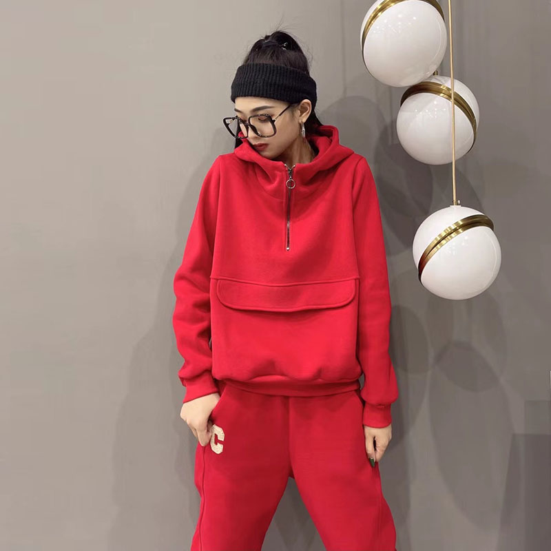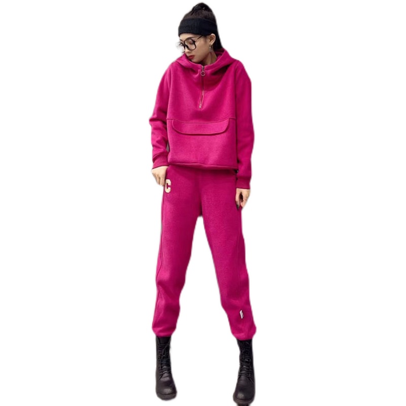 玫红色卫衣套装女加绒加厚2025年新款连帽休闲网红炸街运动两件套