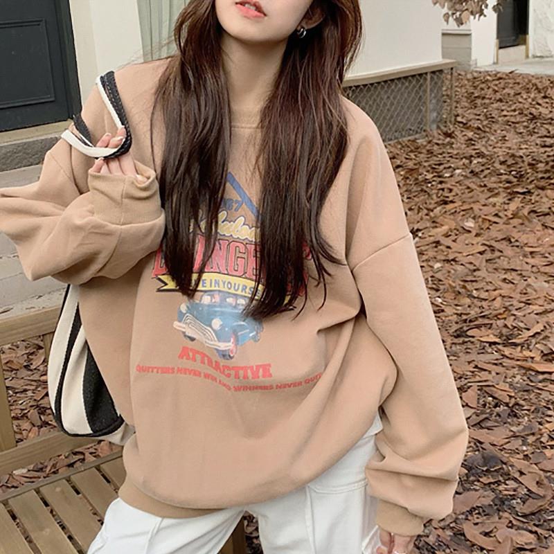 加绒宽松休闲卫衣女秋冬外套古着圆领长袖打底衫上衣外贸韩国女装