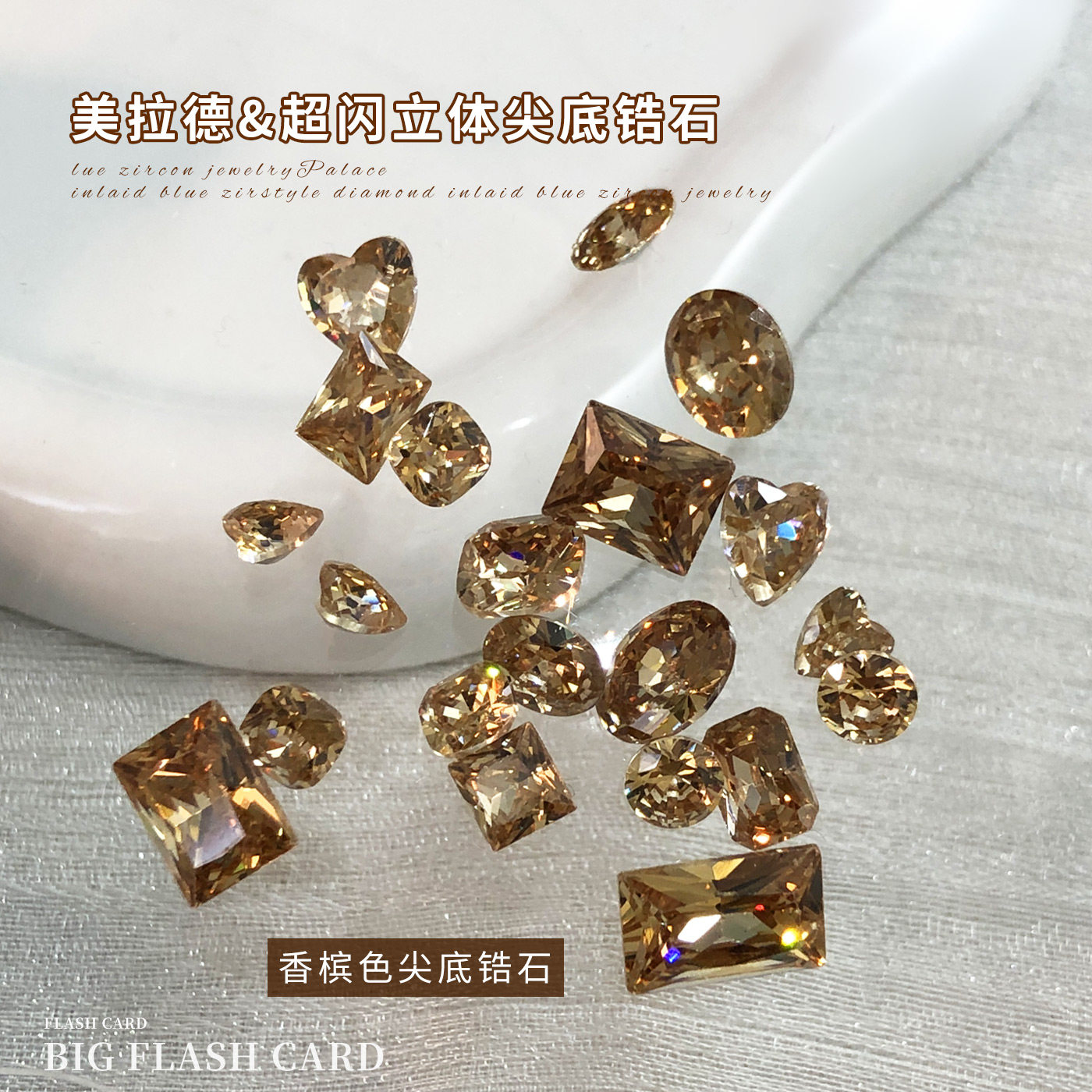 香槟色锆石美甲饰品爆闪美拉德尖底爱心鸽子蛋长直角异形钻石配饰