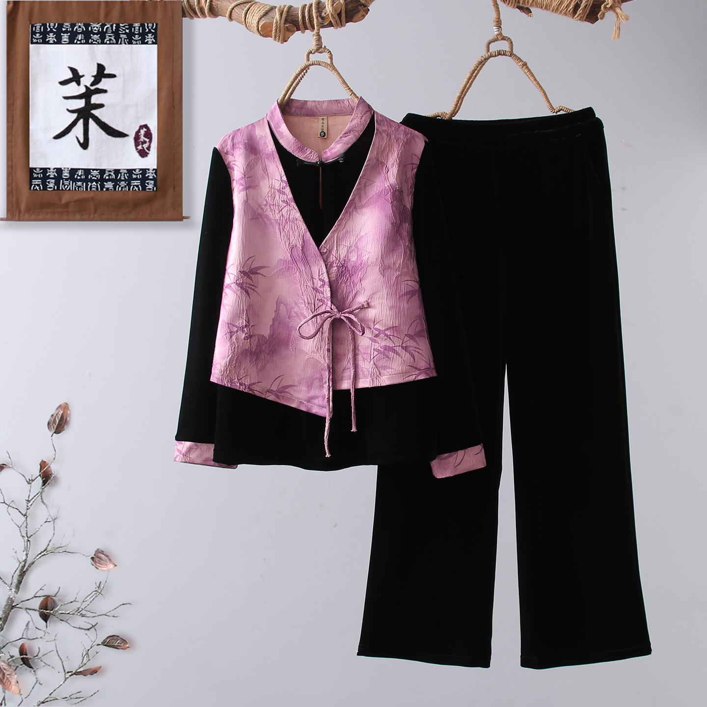 妈妈秋装洋气金丝绒两件套中老年女装高贵新中式宽松上衣50岁套装