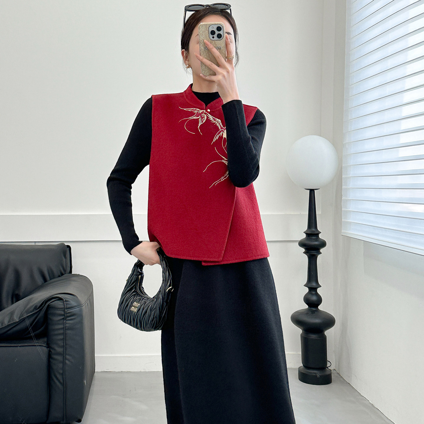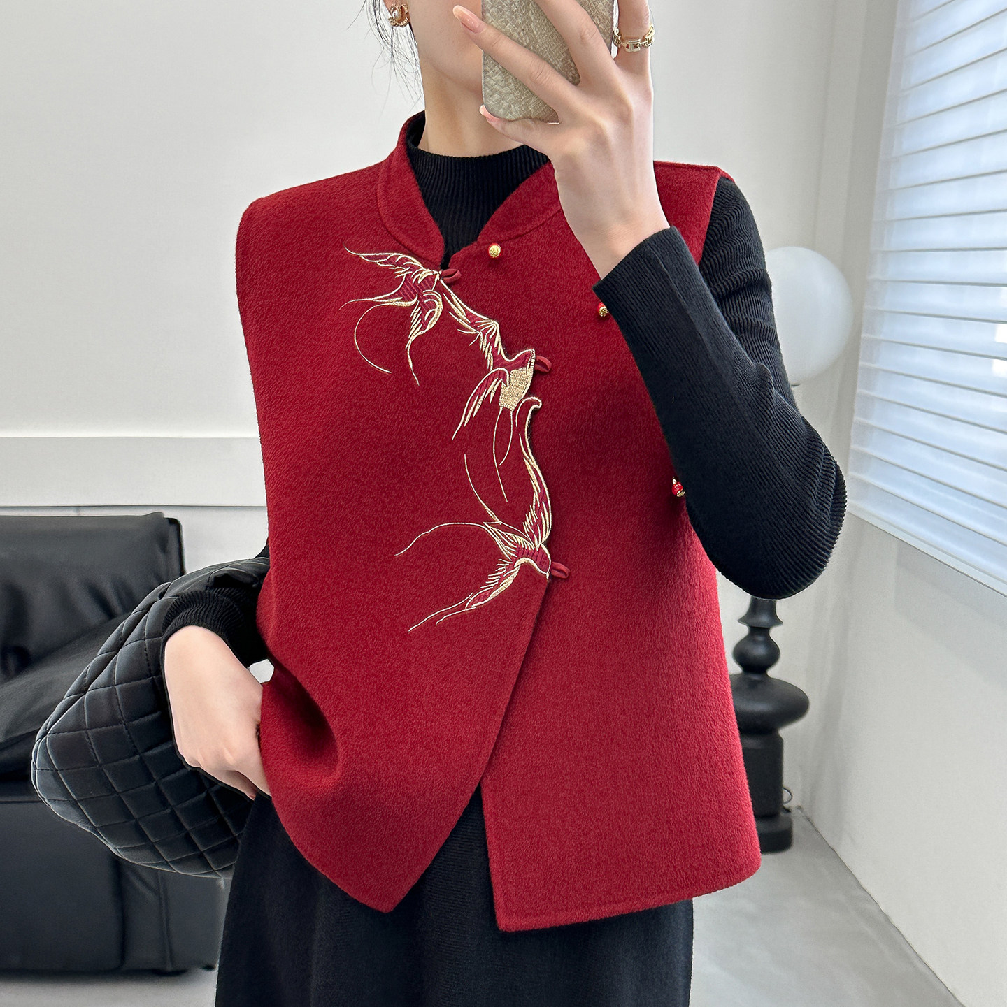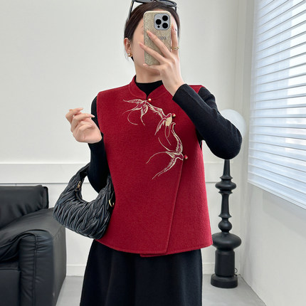 新中式国风红色双面羊毛马甲女轻奢刺绣立领无袖坎肩毛呢外套