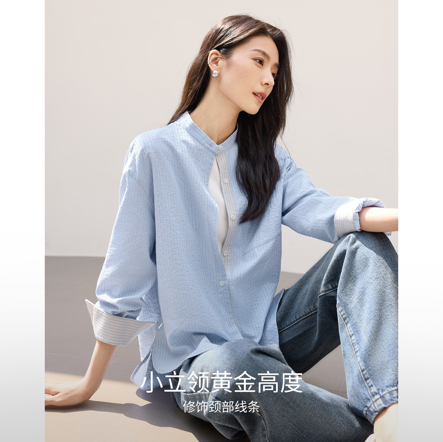 IHIMI海谧立领气质拼色条纹衬衫女秋季衬衣时尚高级感长袖上衣