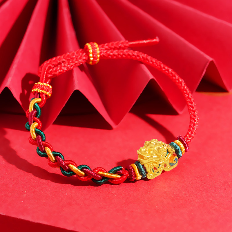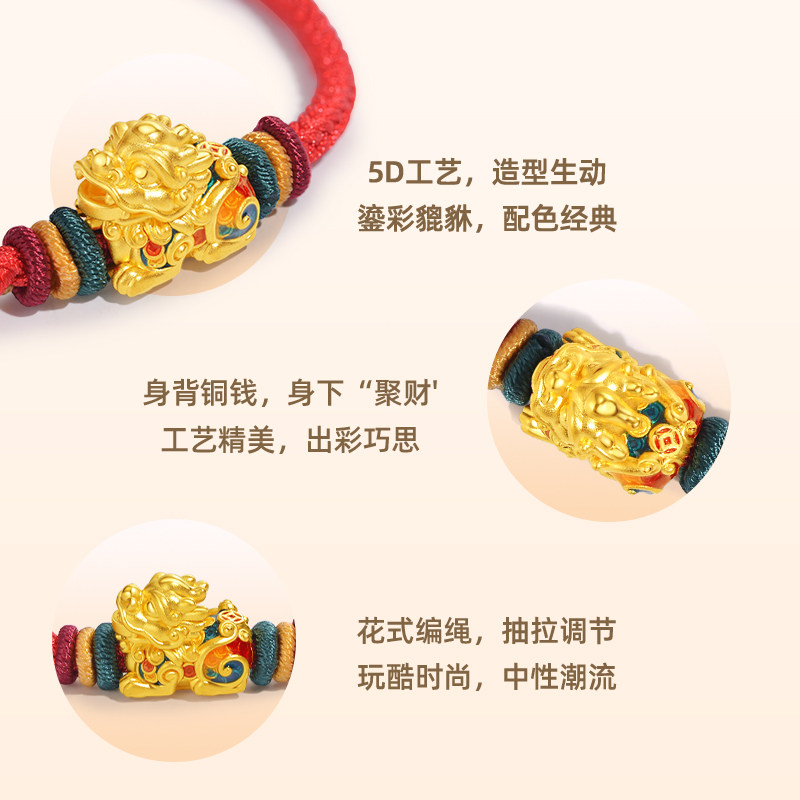 老庙黄金足金潮玩瑞兽系列口吞铜钱貔貅花式红手绳5D鎏彩聚财进