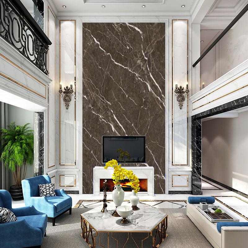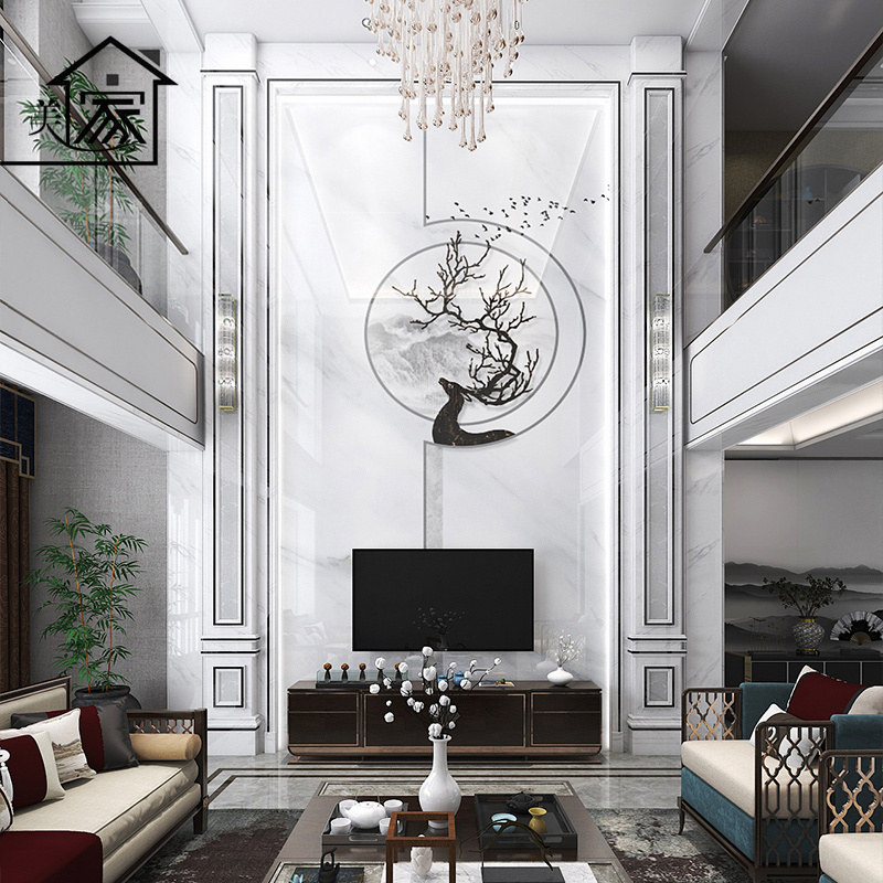 挑高别墅电视背景墙壁纸复式楼客厅壁布中空跃层仿大理石壁画墙布