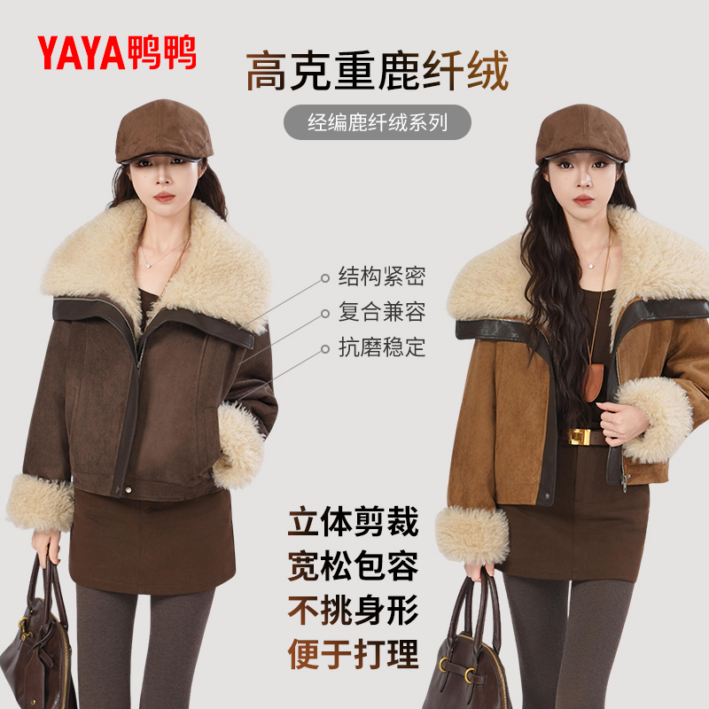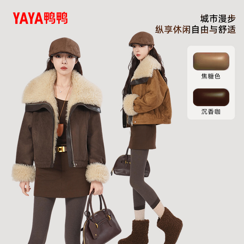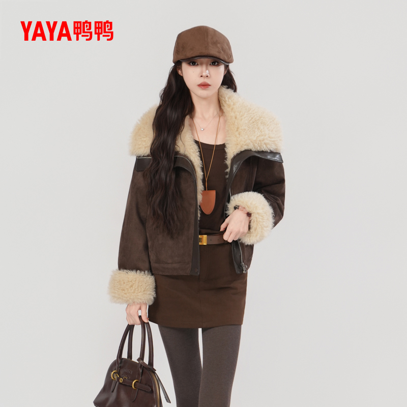 YAYA鸭鸭2025冬季新品羽绒服大翻领气质休闲羊卷毛麂皮绒颗粒外套