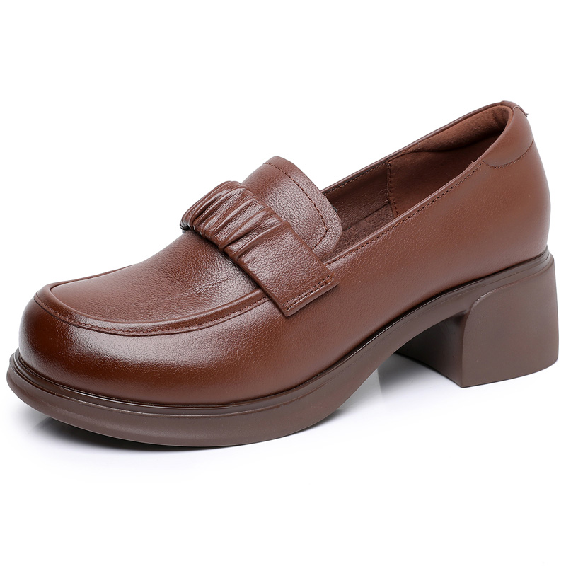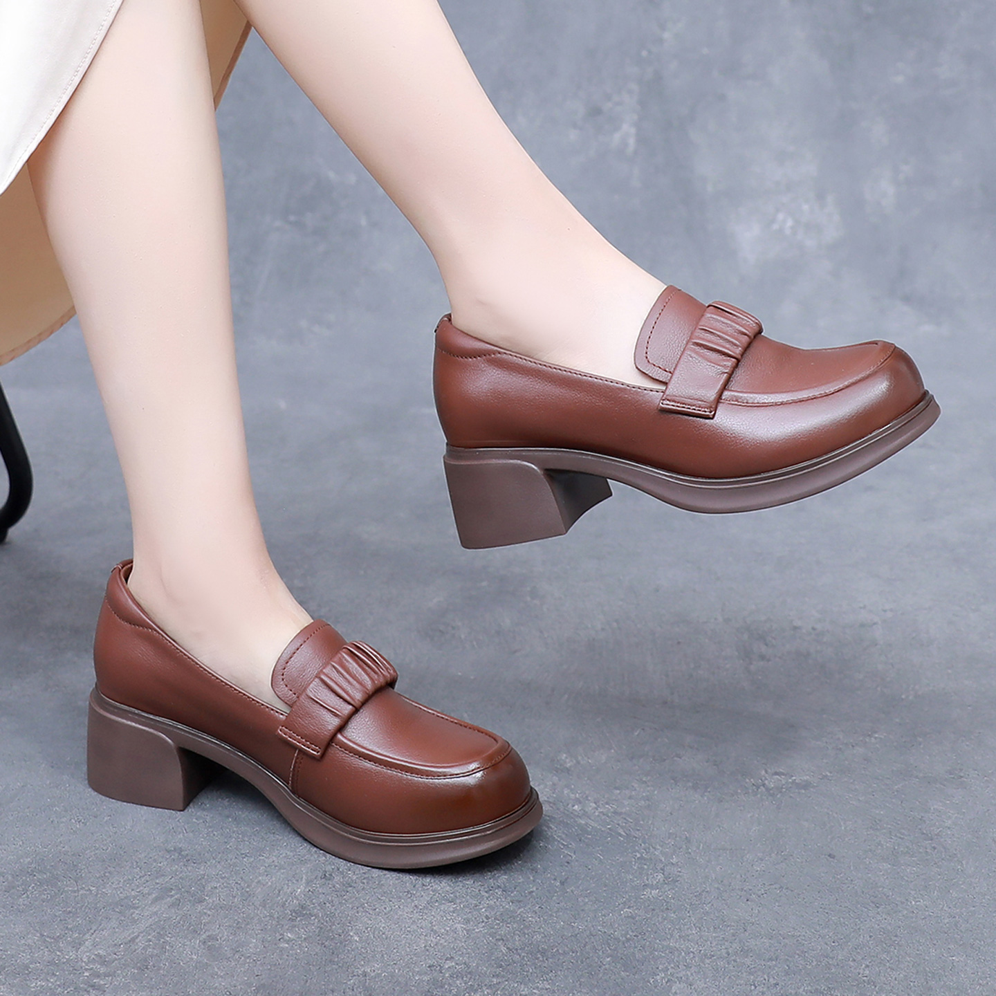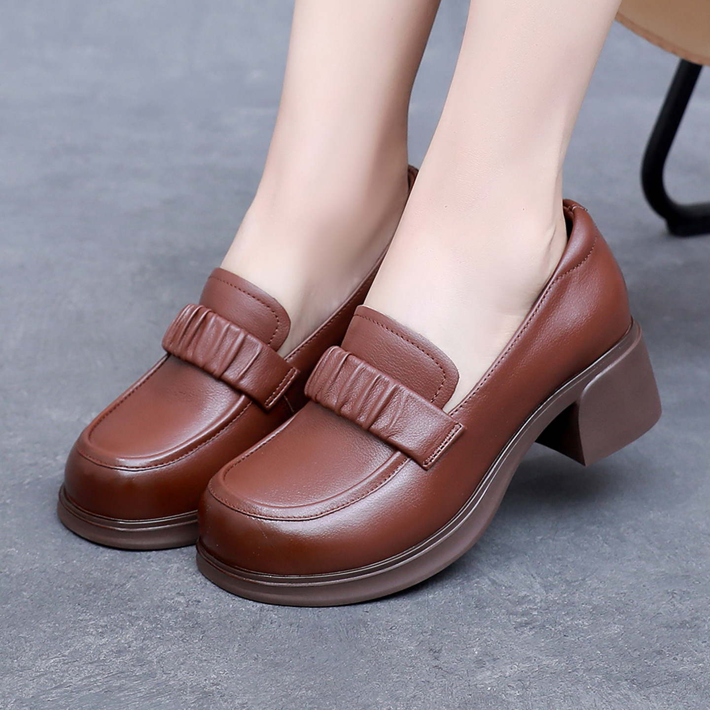羊皮粗跟乐福鞋女春秋真皮厚底单鞋舒适软底妈妈鞋圆头一脚蹬皮鞋