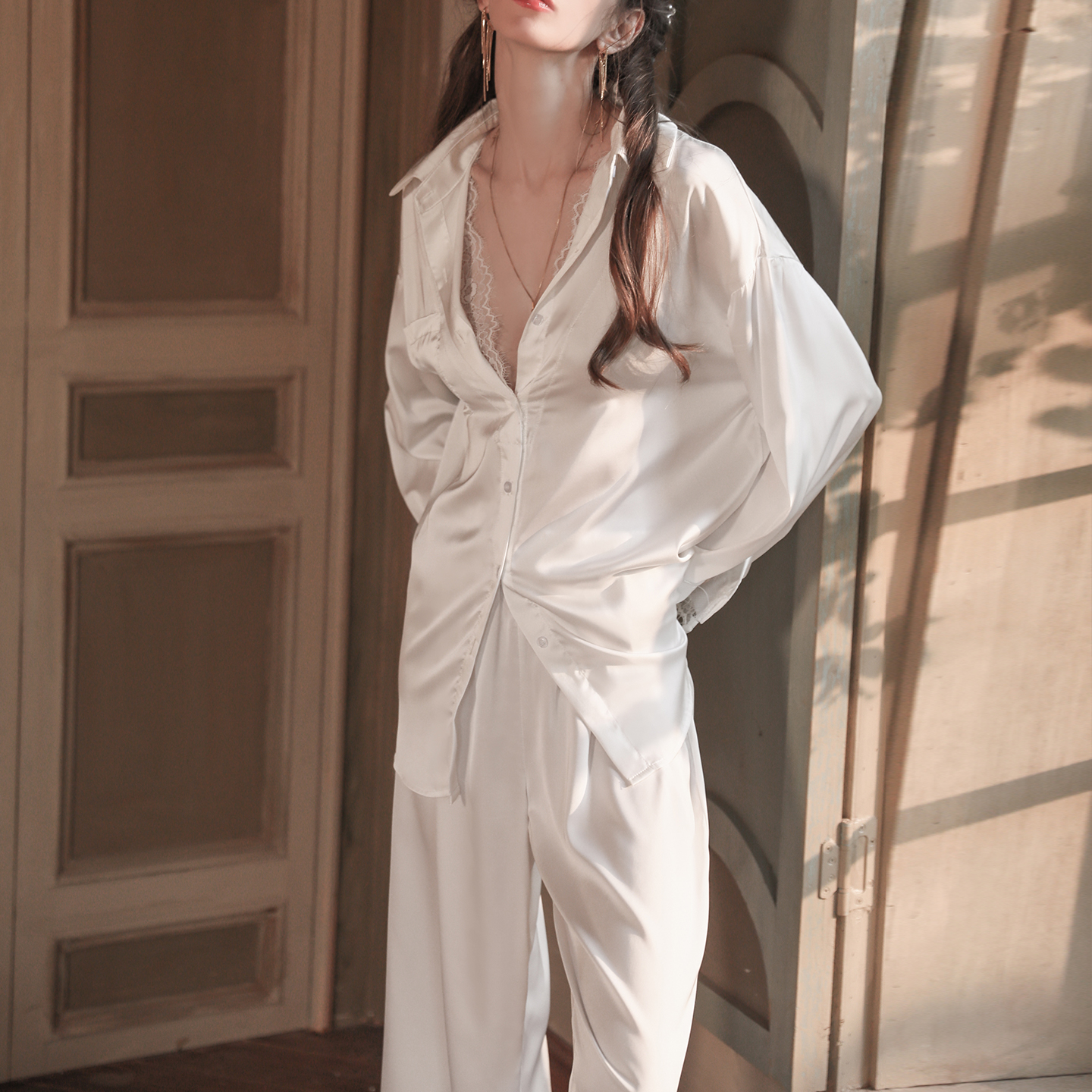 YINELCHUNL睡衣女真丝长袖衬衫高级感丝绸睡裙套装宽松家居服长款