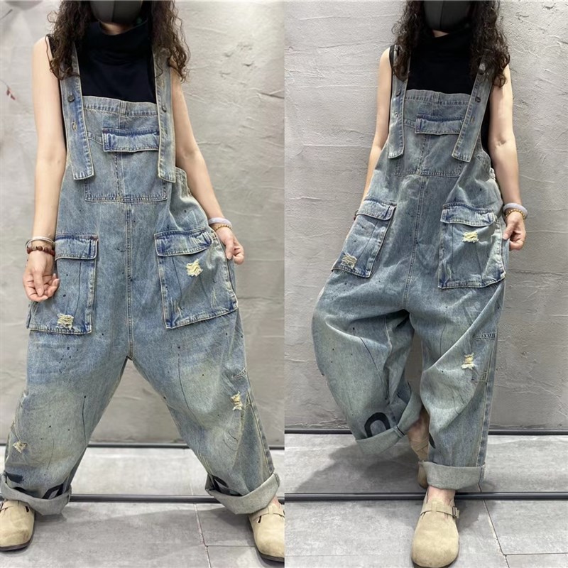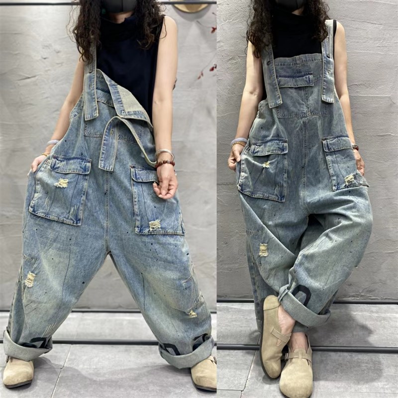 2024夏季新款潮流韩版个性复古破洞浅蓝色宽松牛仔背带裤女阔腿裤