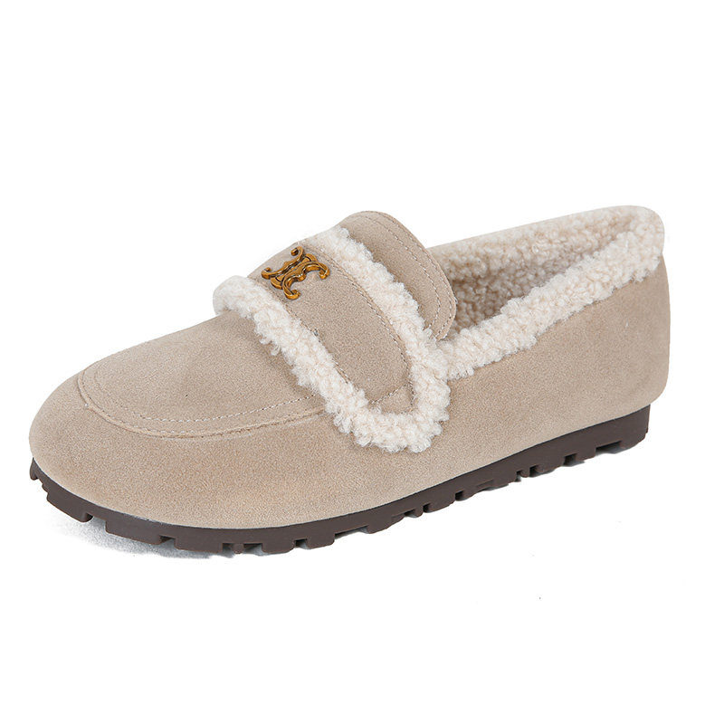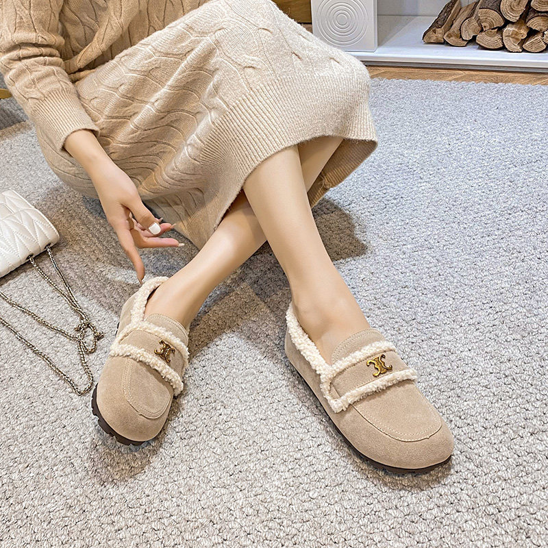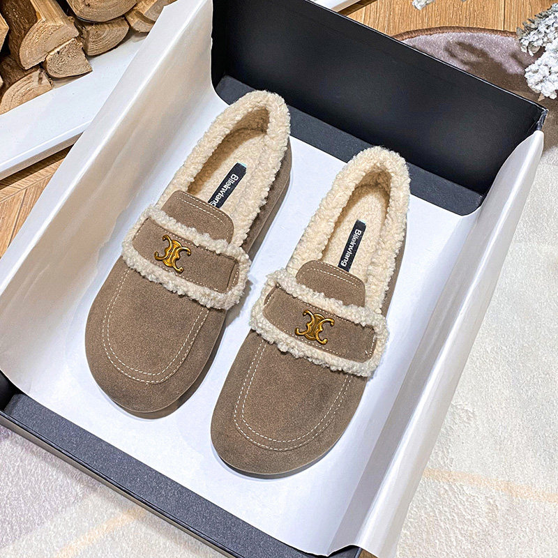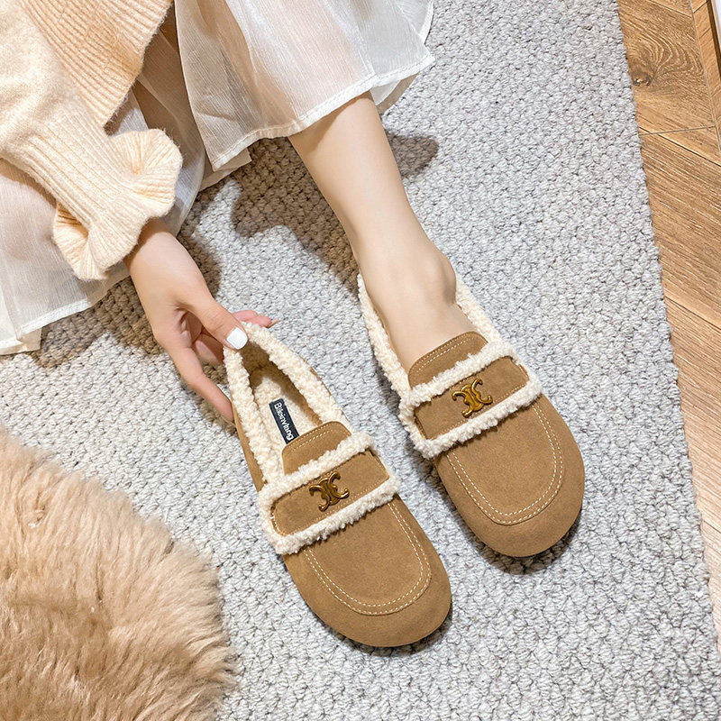方头勃肯鞋女秋冬毛毛鞋加绒棉鞋外穿豆豆鞋一脚蹬小码女鞋33 34