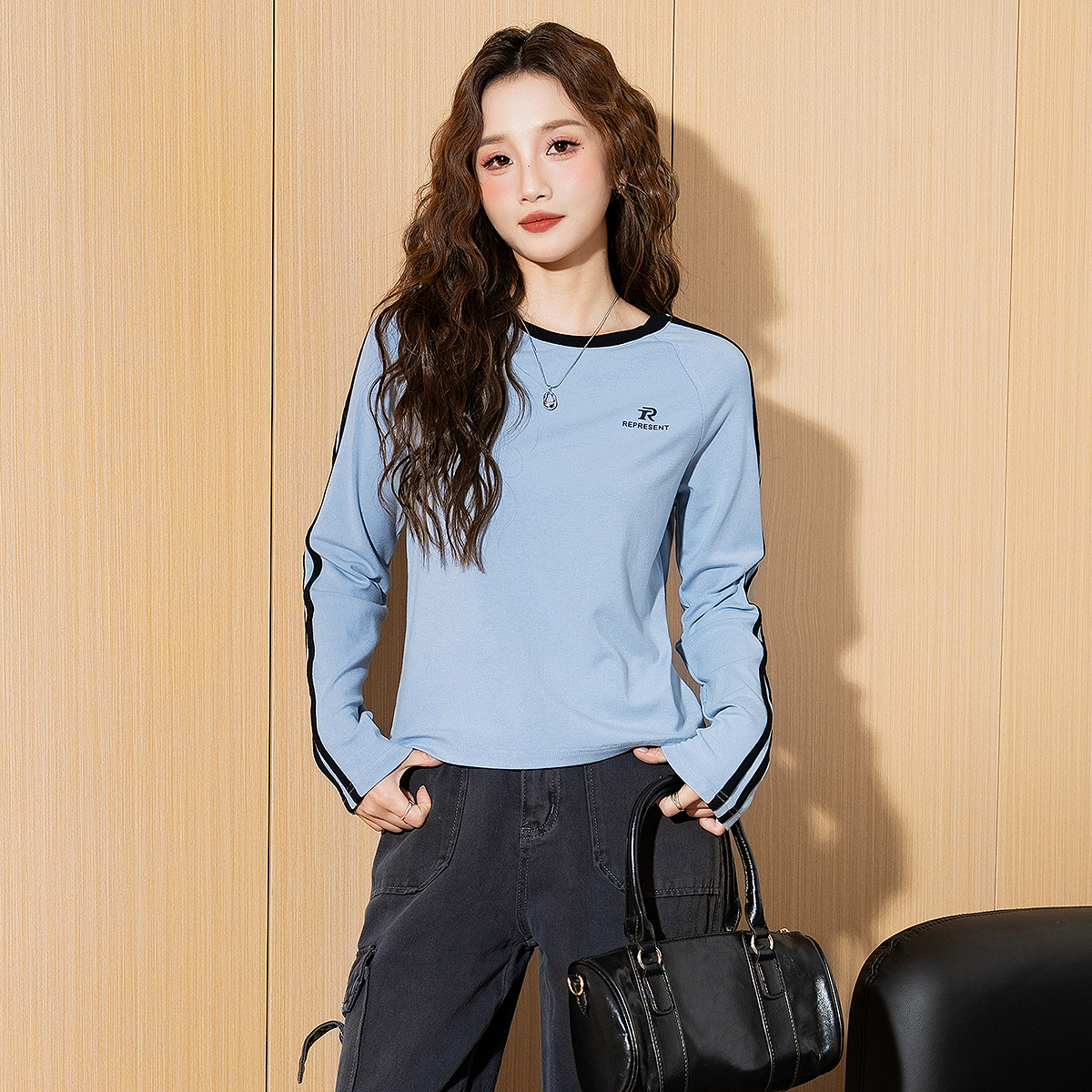 唐狮2025年秋冬新款女长袖T恤美式复古手臂条纹辣妹修身正肩t恤