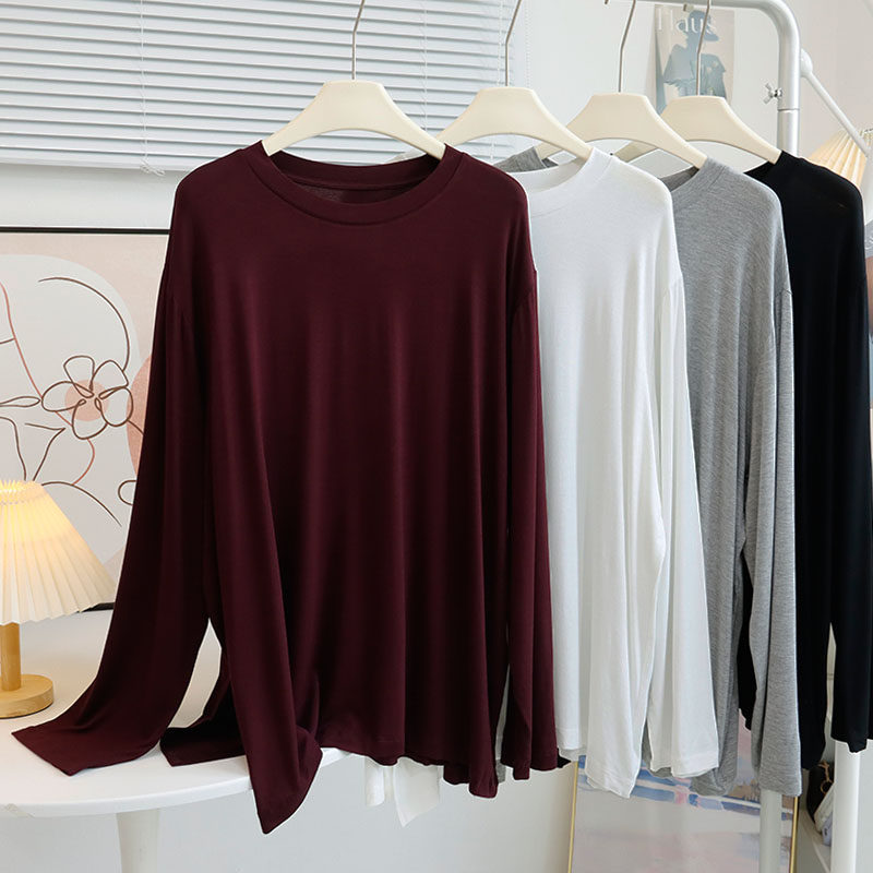 早秋中长款外穿宽松大码圆领莫代尔长袖T恤慵懒开叉上衣打底衫女