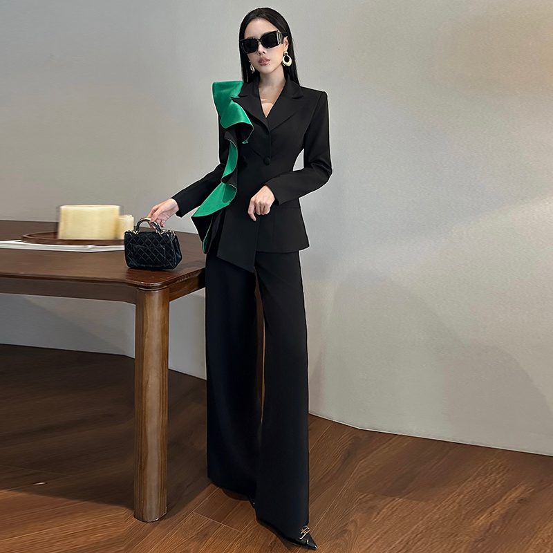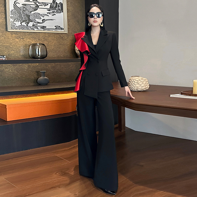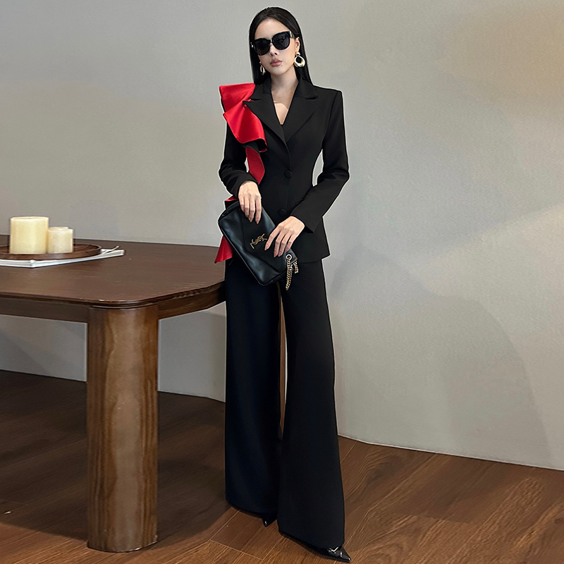 2025秋冬新款名媛撞色西装外套高腰阔腿裤时尚职业套装优雅两件套