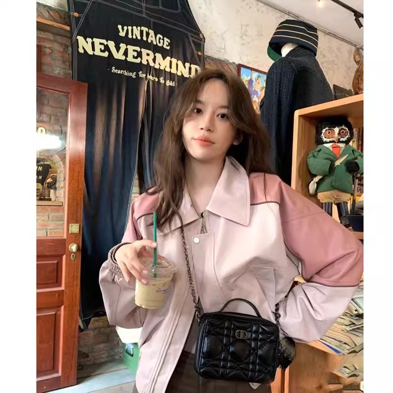 欧货短款粉色pu皮衣外套女美式拼接机车夹克2023年新款爆款高级感