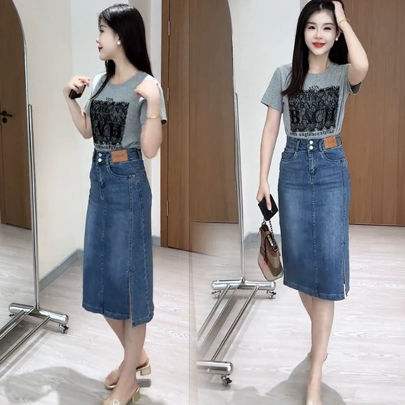 时尚牛仔裙套装女2025夏季新款洋气显瘦时髦T恤高腰半身裙两件套