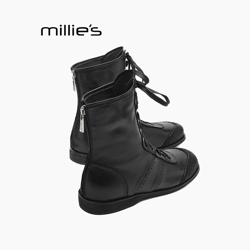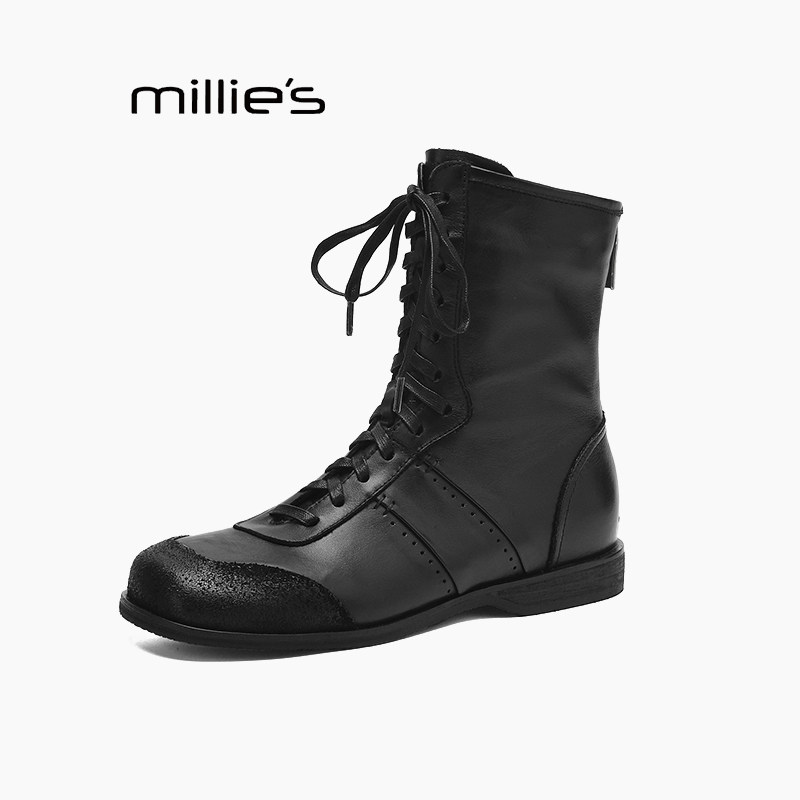 MILLIE'S/妙丽复古马丁靴女英伦平底方头真皮系带短靴黑色户外靴Q