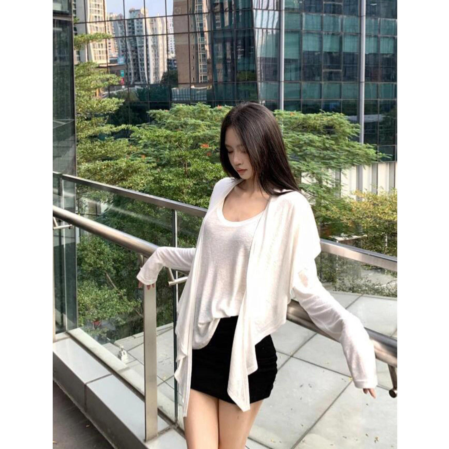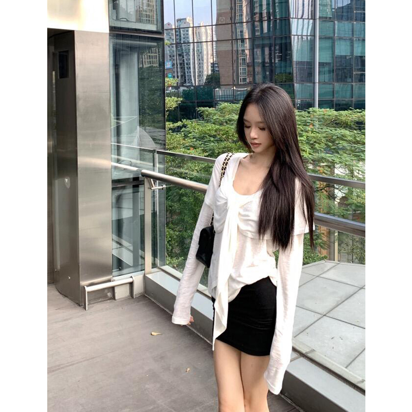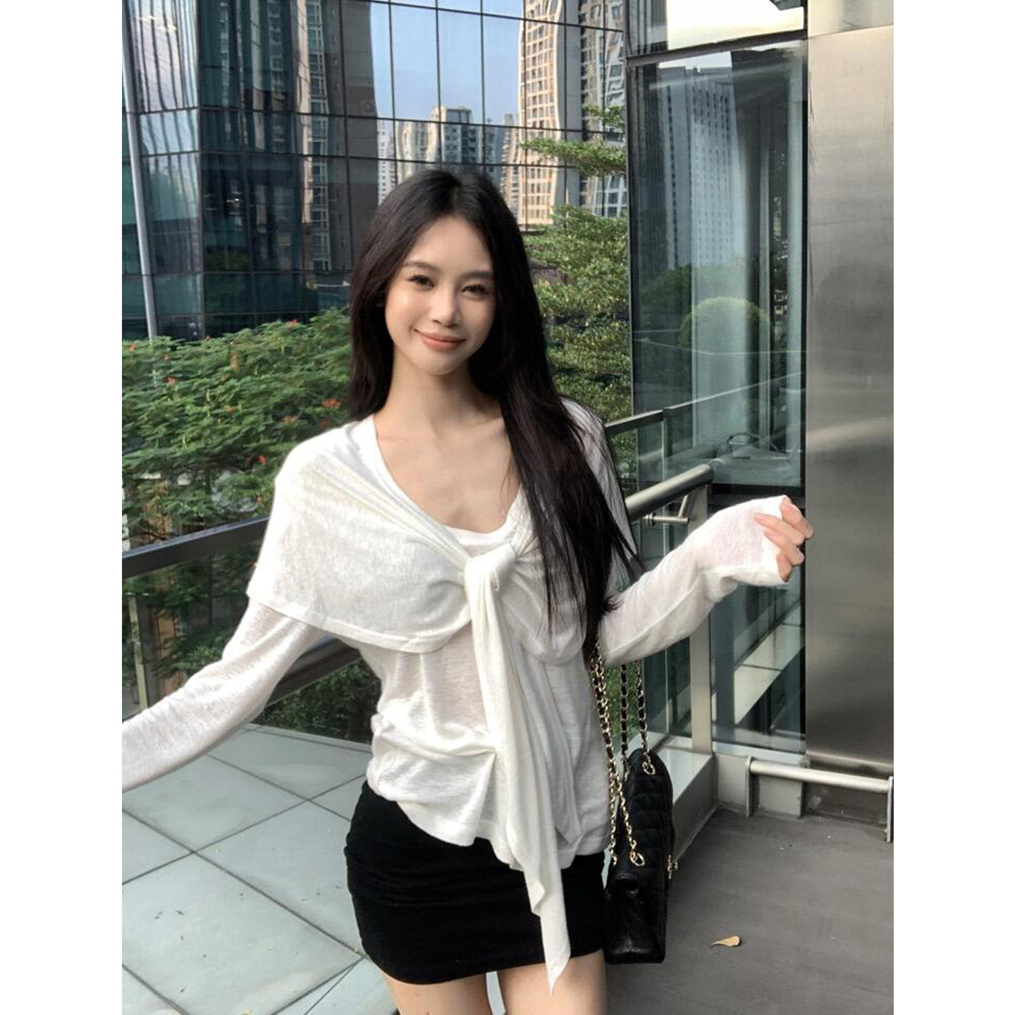 设计感绑带披肩长袖T恤两件套