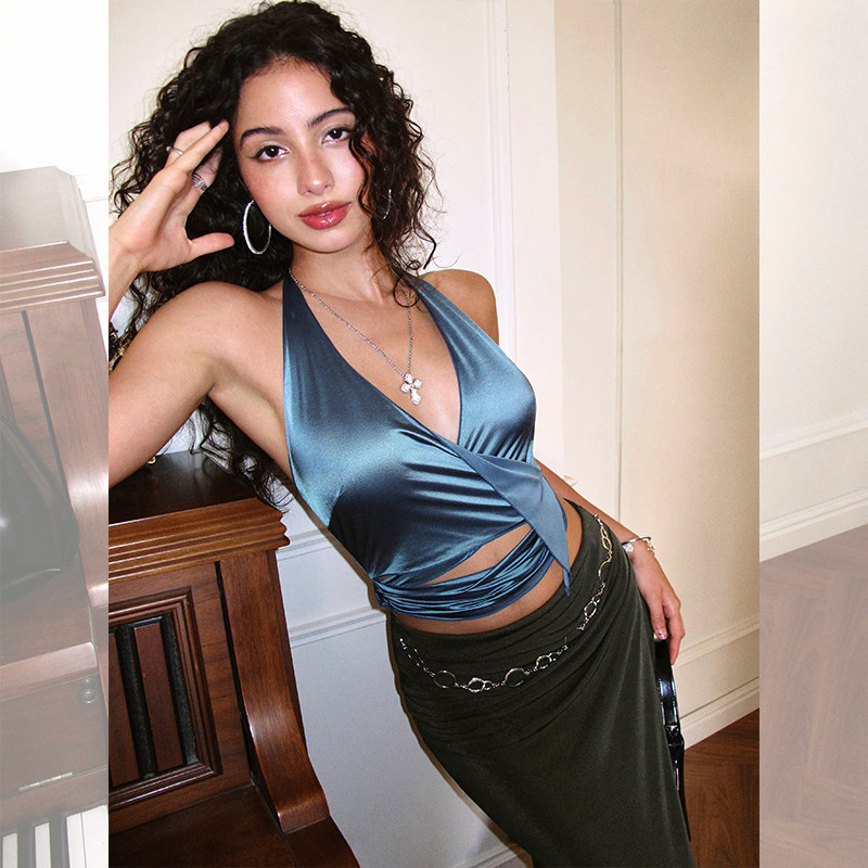 ITSNIKAR 复古缎感V领挂脖上衣女设计感吊带背心半身裙套装两件套