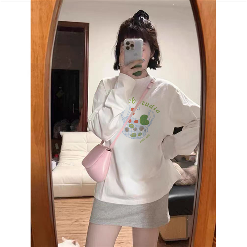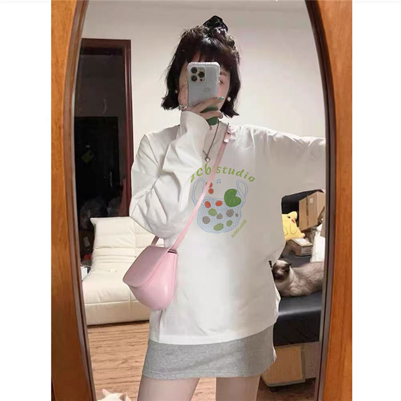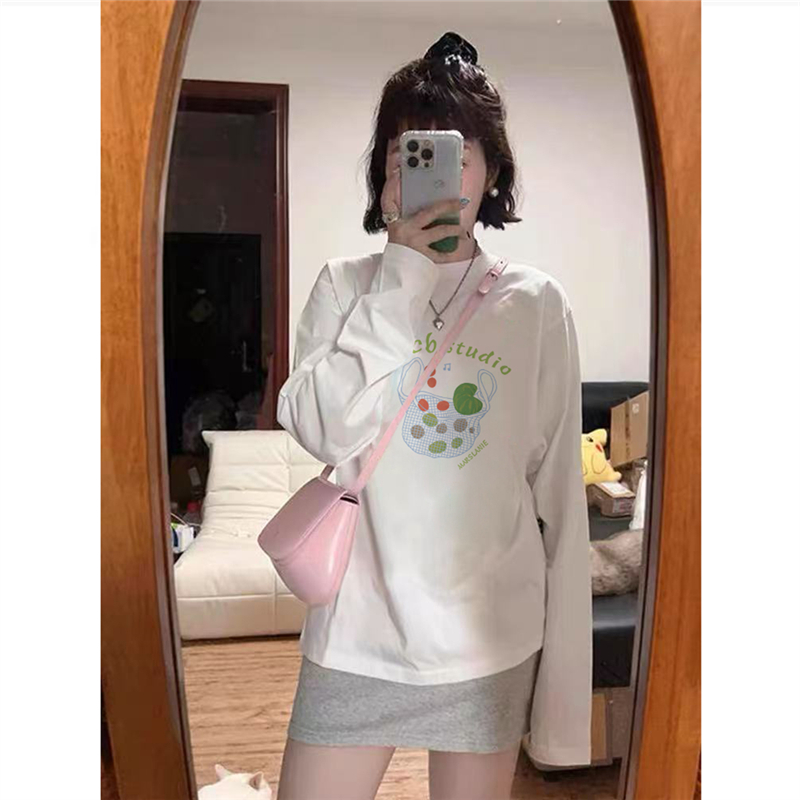 纯棉早秋设计感正肩长袖t恤女2025新款宽松时尚减龄白色打底体恤