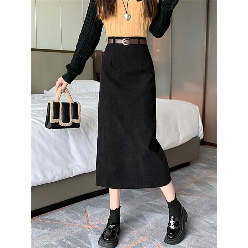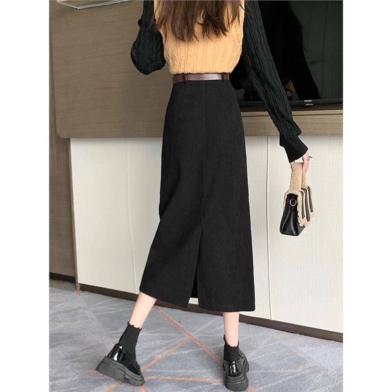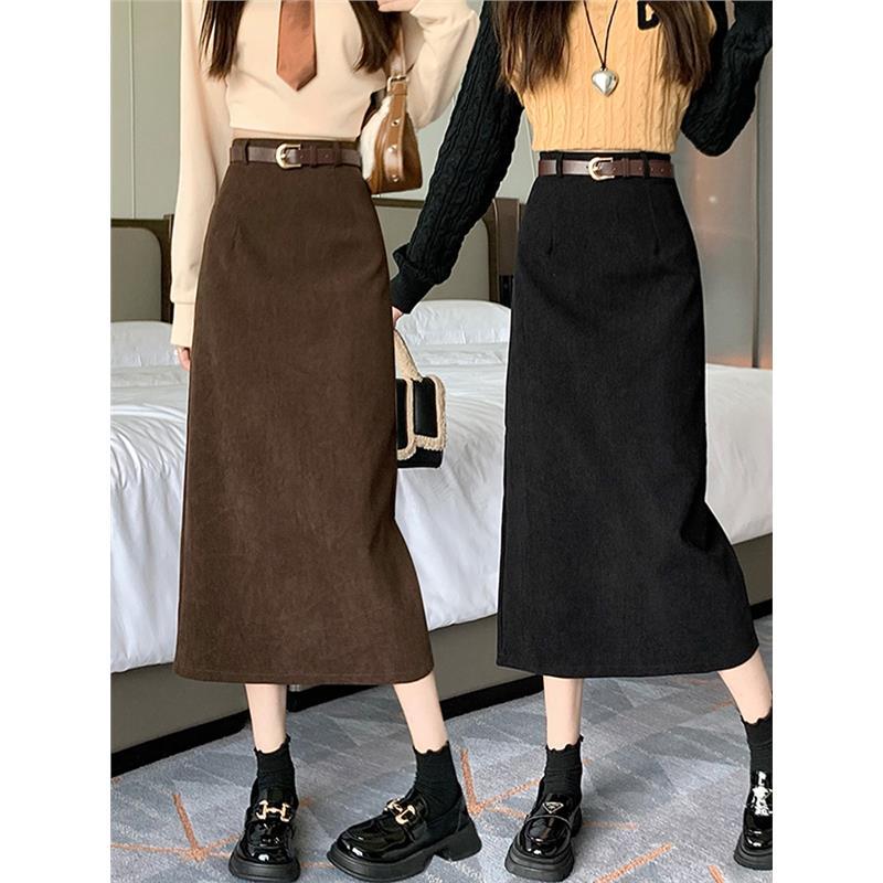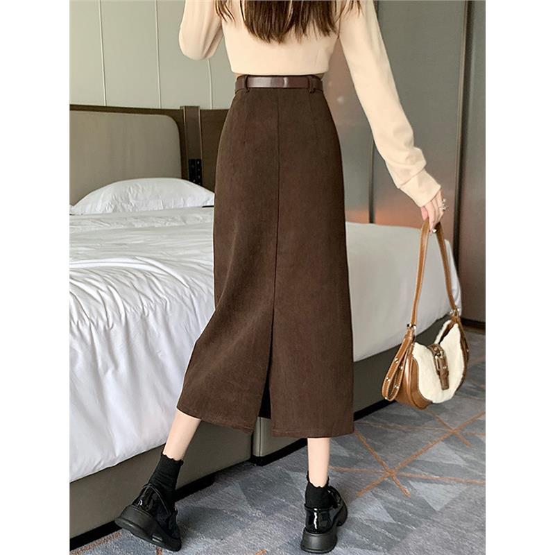 棕咖色加厚灯芯绒半身裙女秋冬2025新款高腰显瘦开叉包臀一步长裙