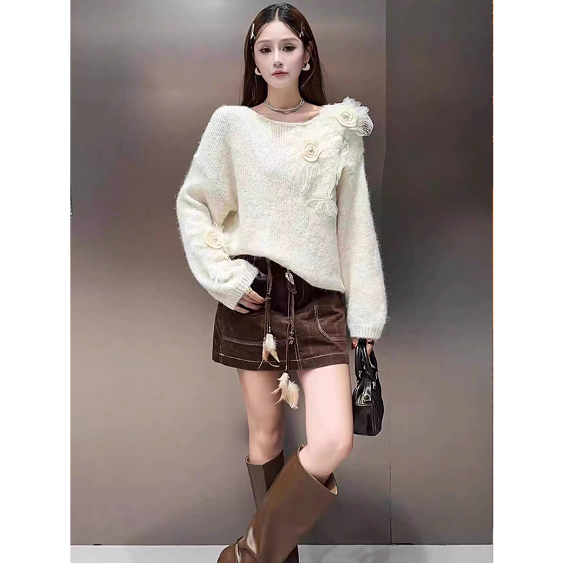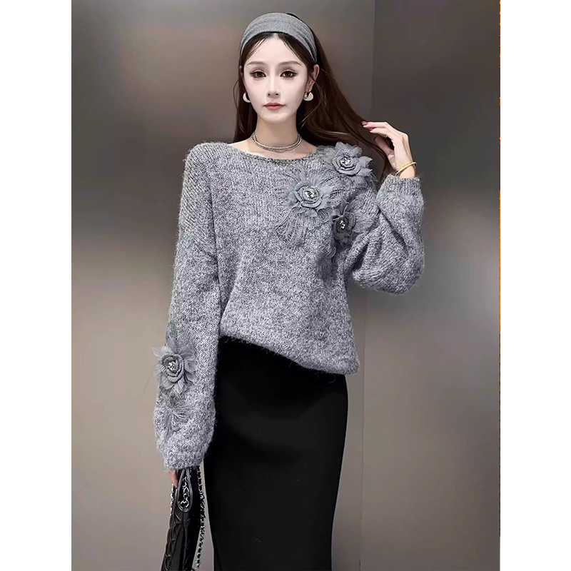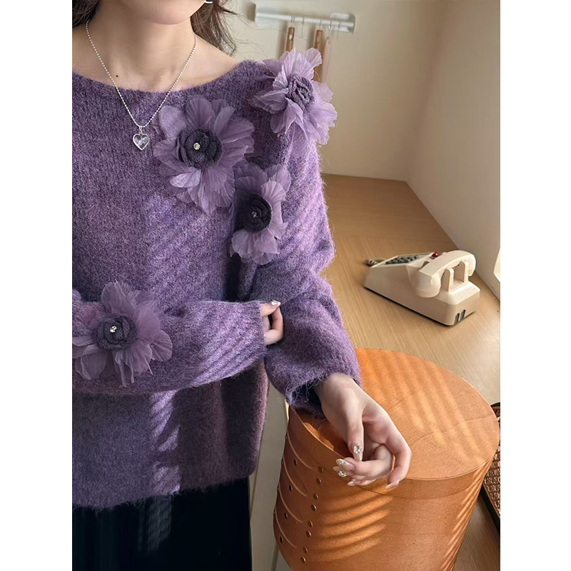 韩系慵懒风立体花朵紫色针织衫女2025秋冬新款宽松显瘦毛衣上衣潮