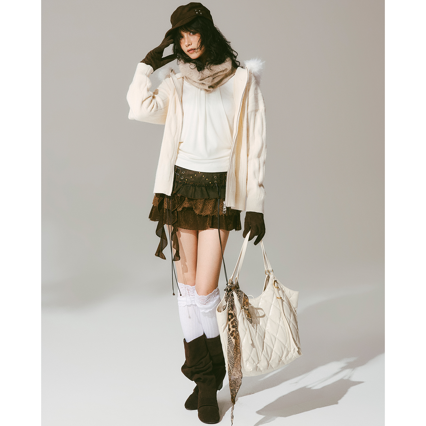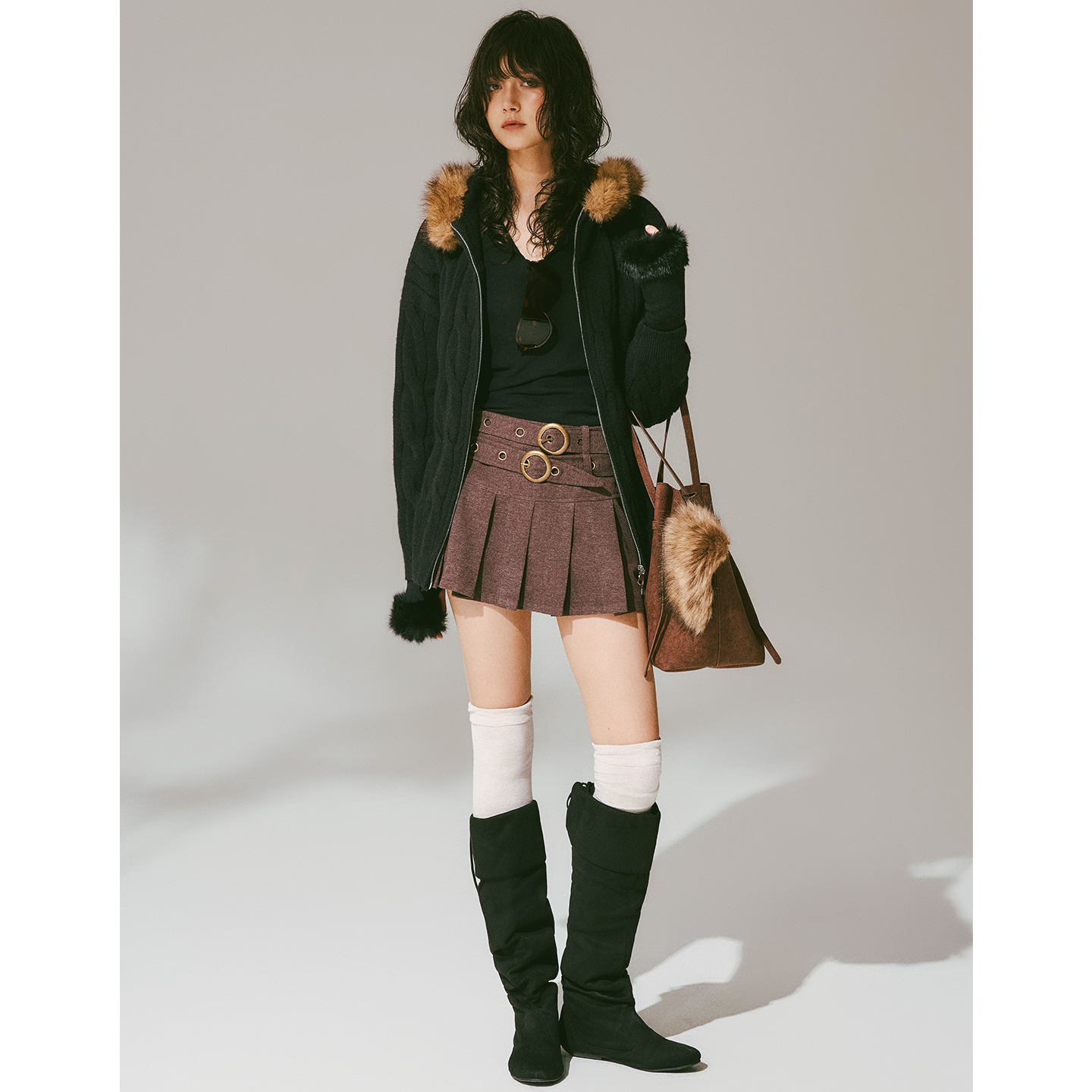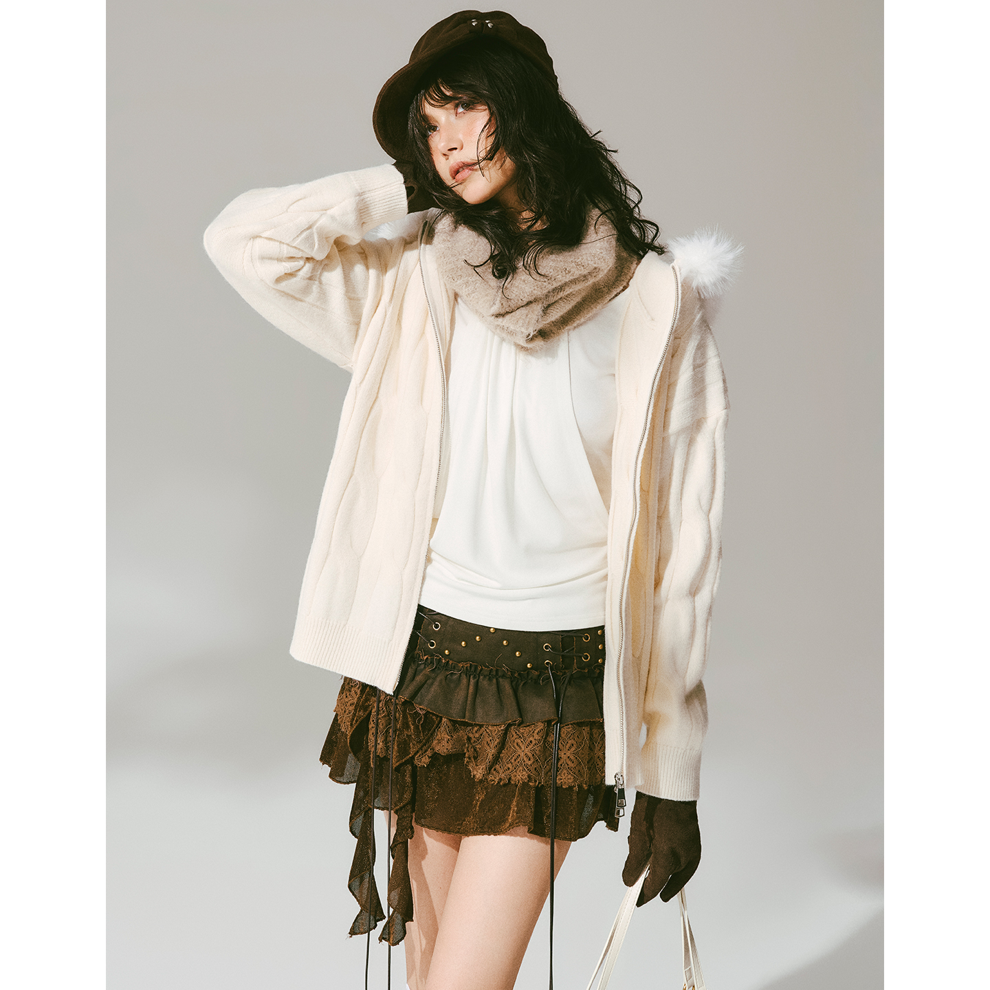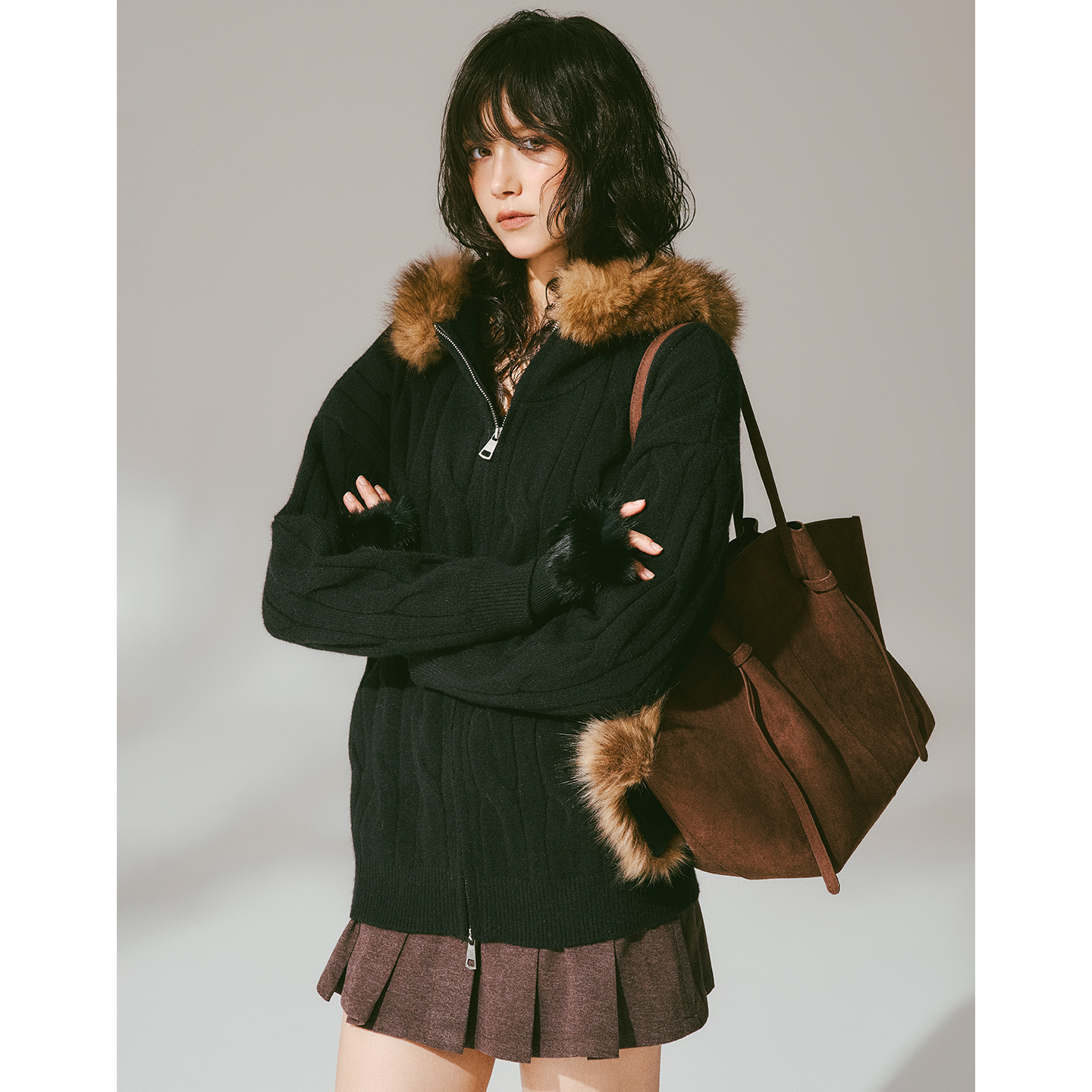 USS 复古麻花毛衣女秋冬连帽毛领宽松显瘦保暖针织开衫外套上衣