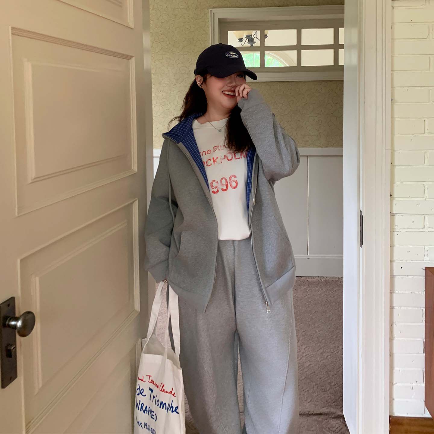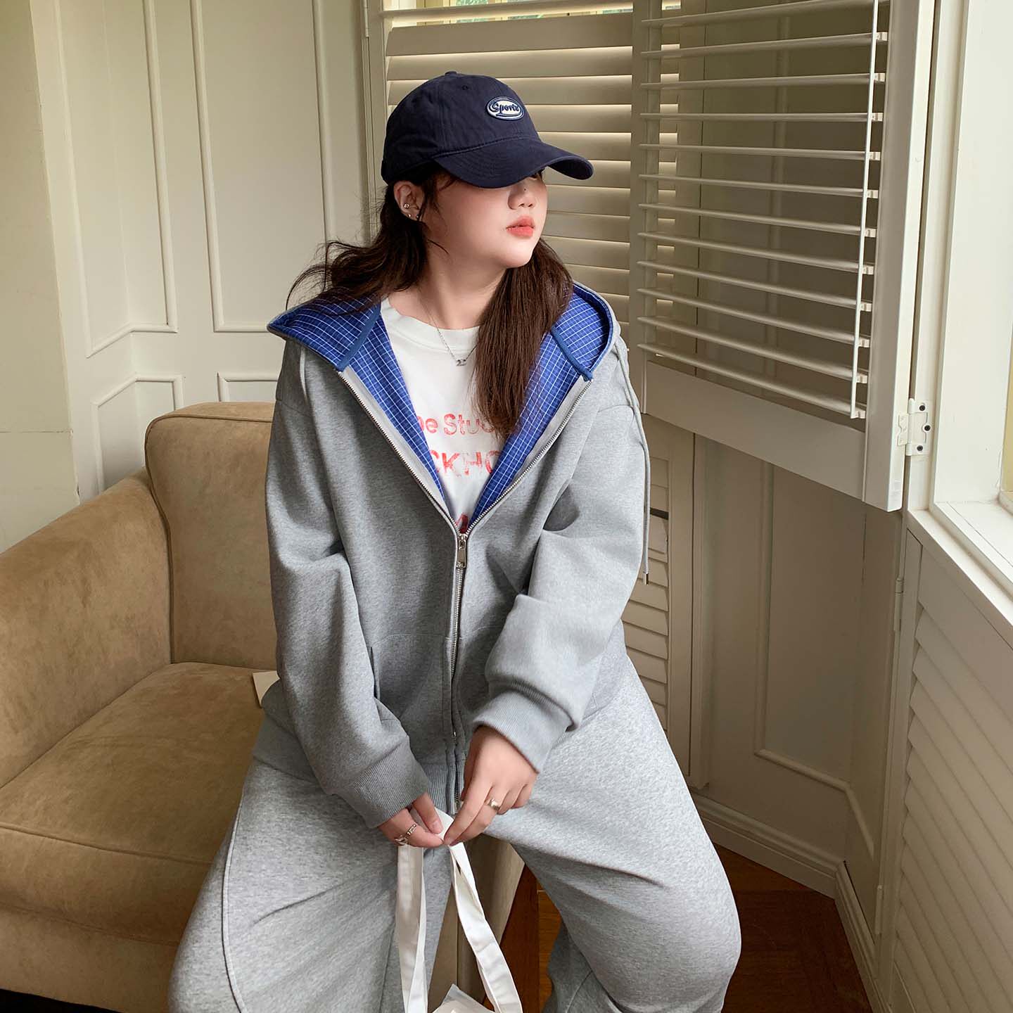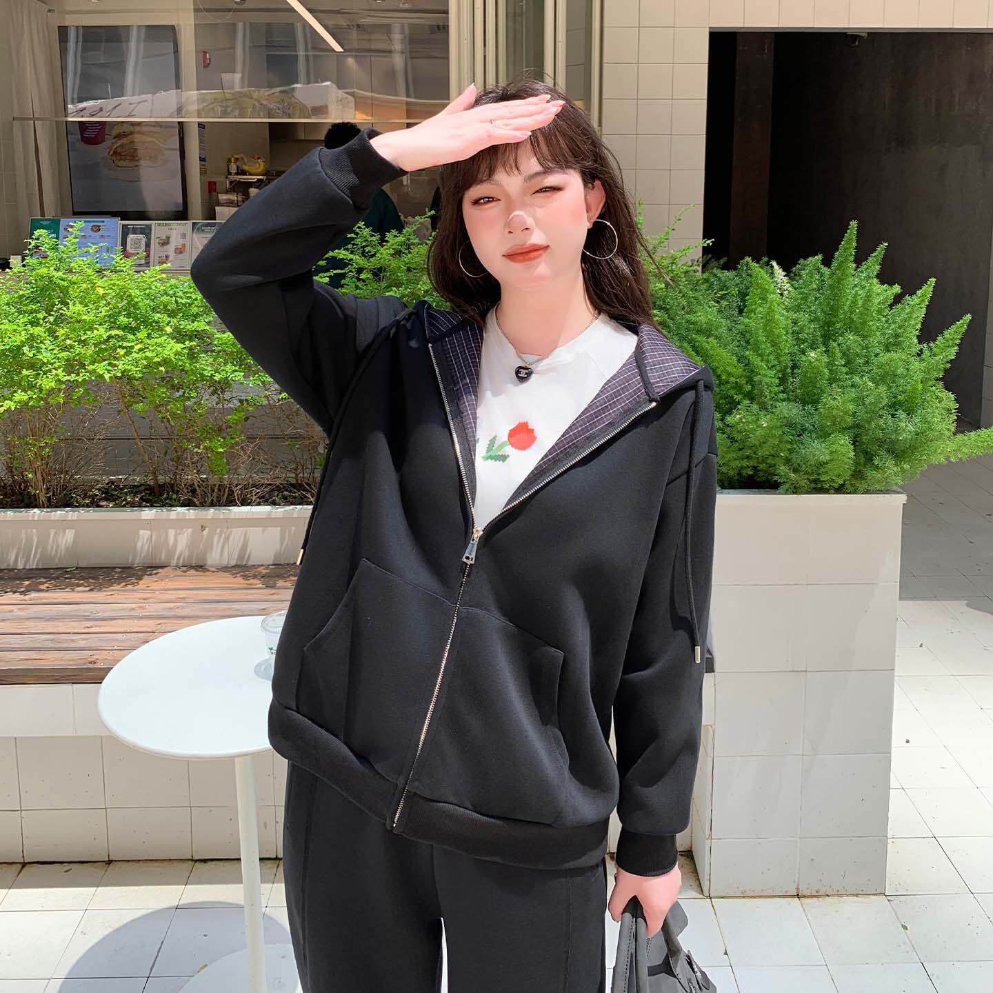 YUZI鱼子拉链连帽卫衣特大码女装学院风复古简约纯色减龄春季胖mm