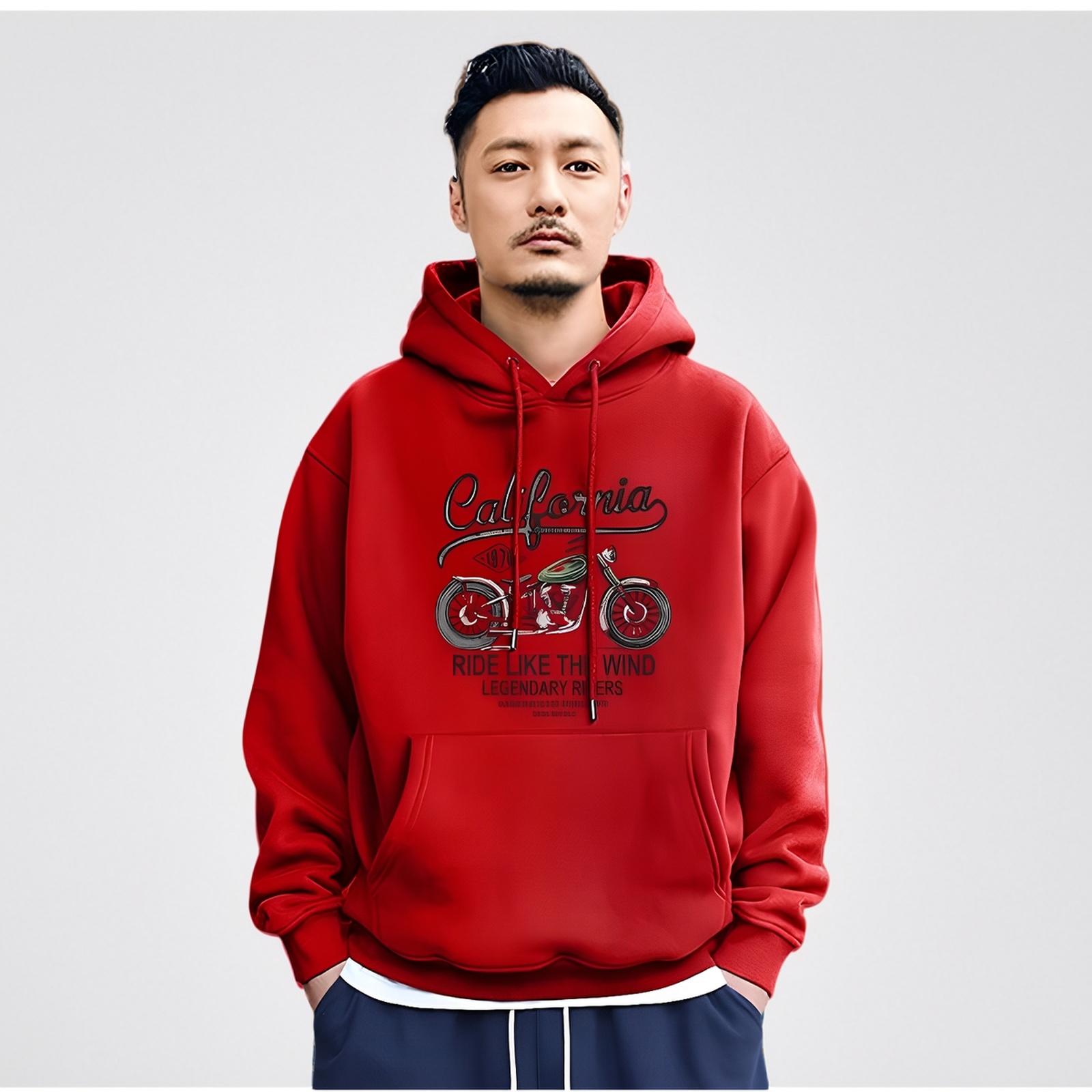 香港潮牌440G连帽复古卫衣男士纯棉重磅机车印花宽松红色帽衫外套