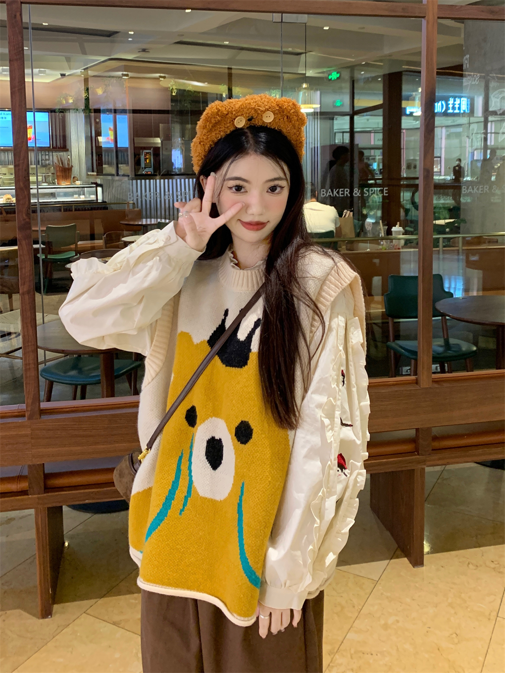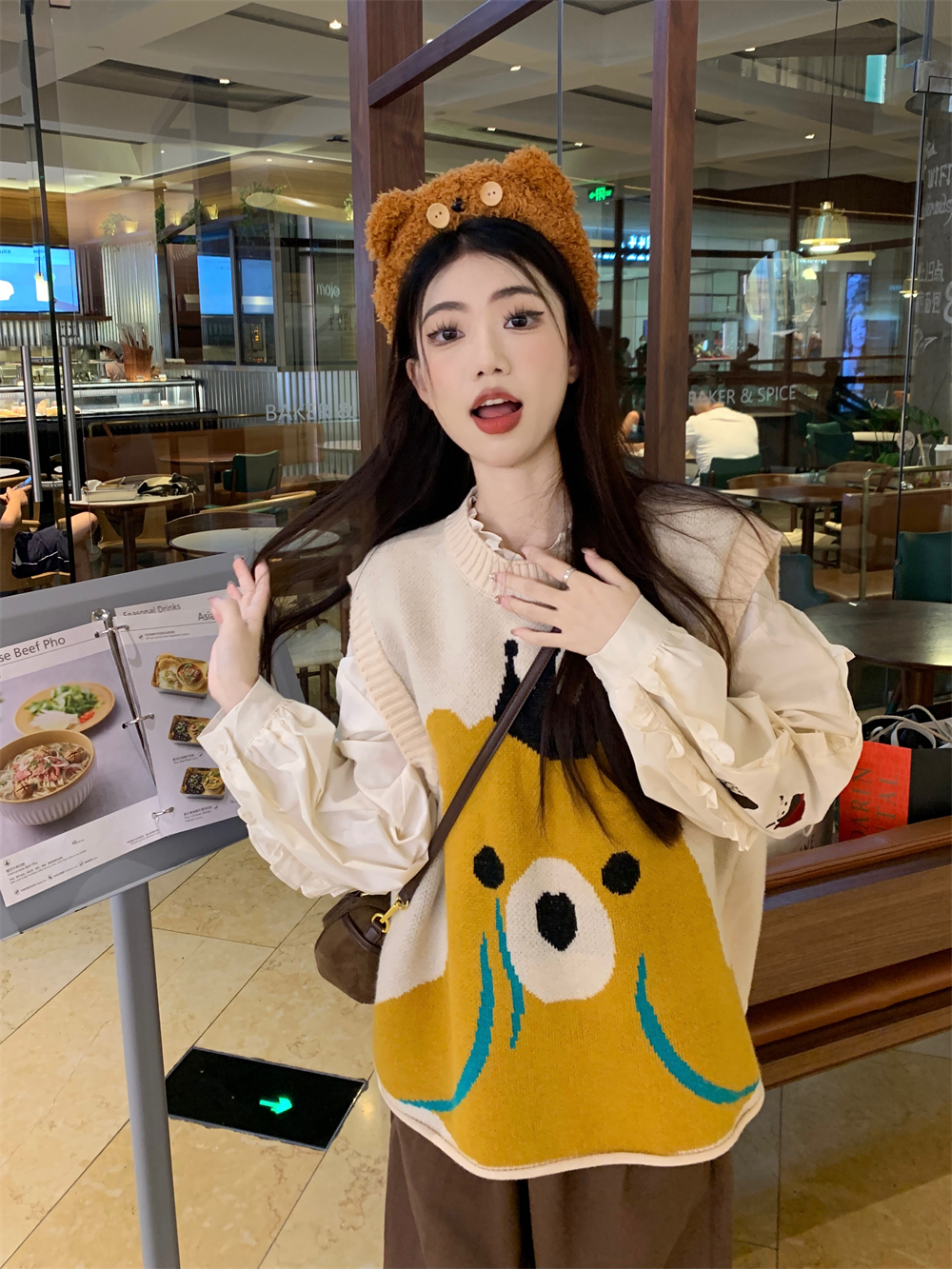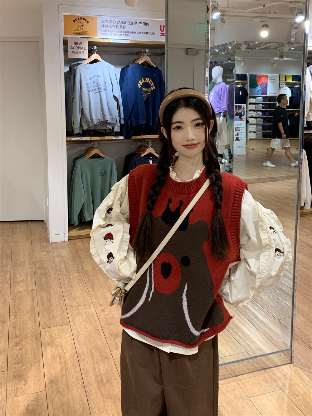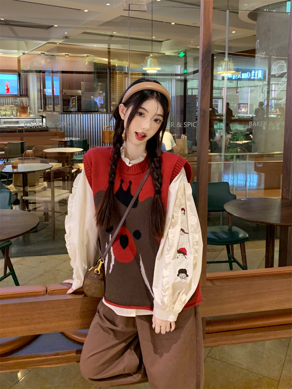 时尚套装女春秋款学院风卡通小熊毛衣针织马甲搭配花边衬衫两件套