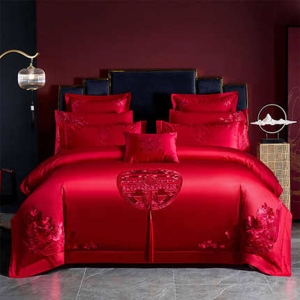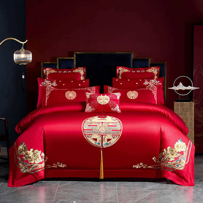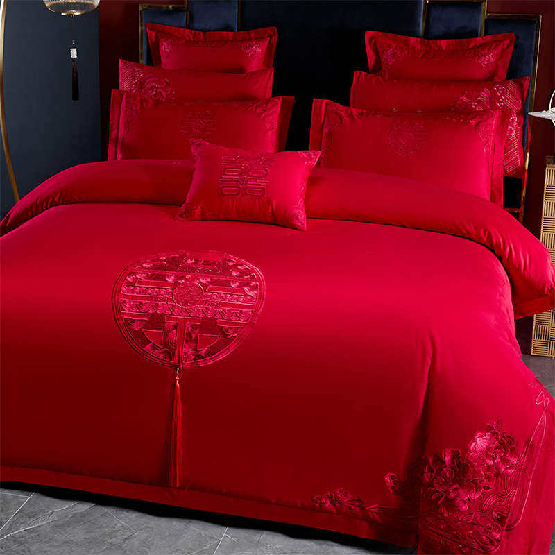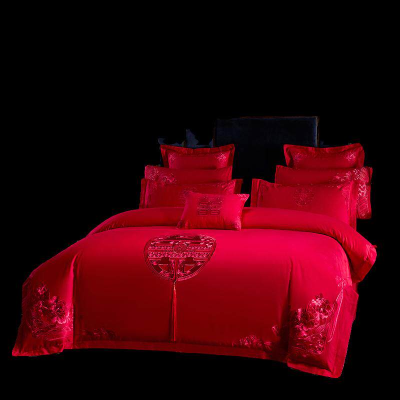 结婚庆喜被四件套大红色刺绣囍字全棉纯棉被套床单婚房床品四季款