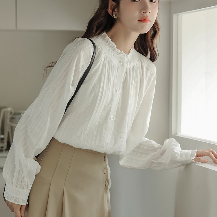 实拍/2025年早秋新款荷叶领甜美宽松雪纺纯色内搭衬衣衬衫女2