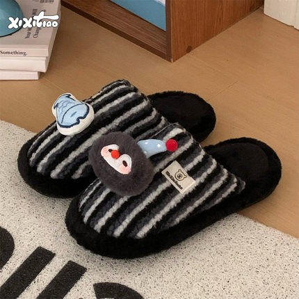 细细条 情侣撞色条纹防滑居家棉拖鞋秋冬可爱企鹅小鱼毛毛鞋男女