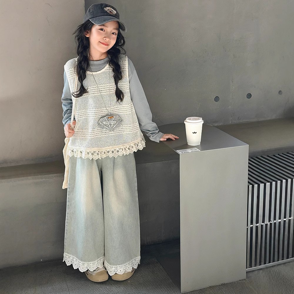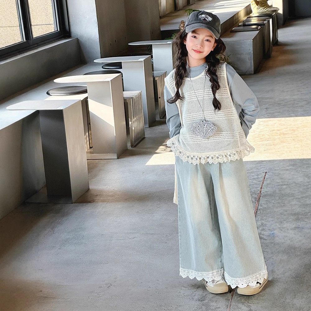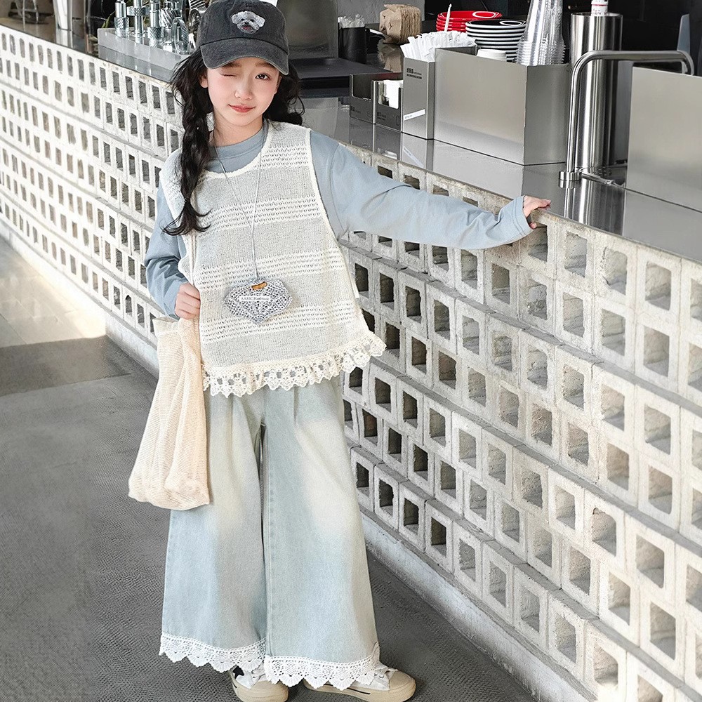 女童套装春秋款2025新款儿童时髦洋气春装大童长袖T恤马甲三件套