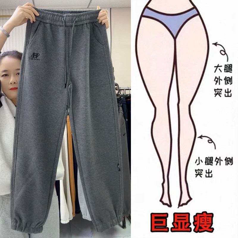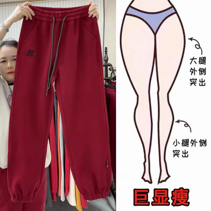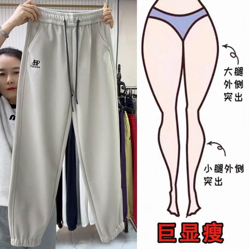 欧货早春休闲运动裤女士高腰抽绳洋气刺绣百搭显瘦直筒束脚哈伦裤