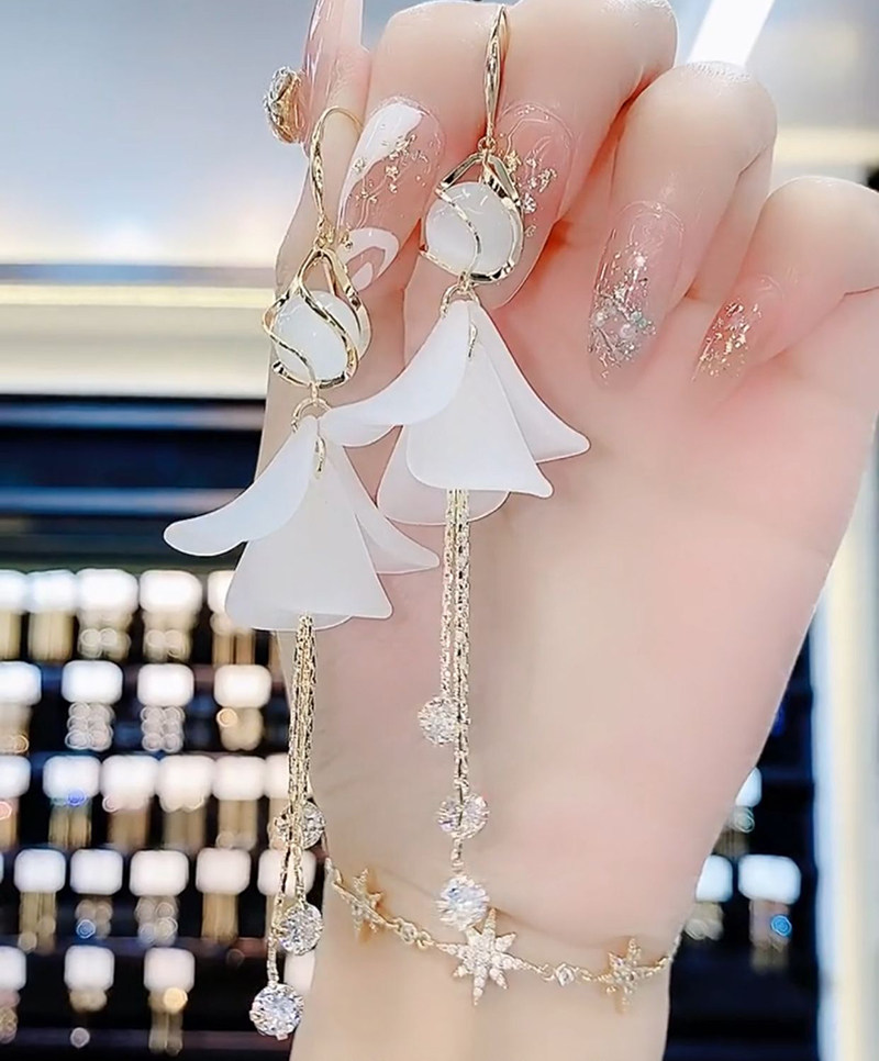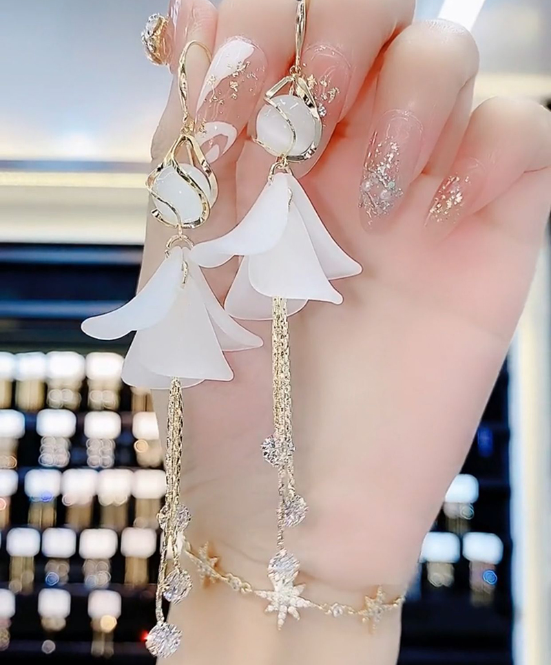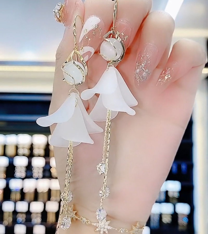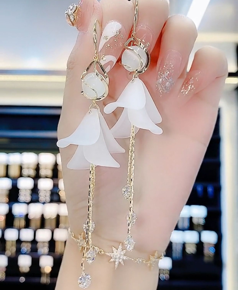 花朵白色裙子猫眼石气质高雅耳环流苏长款2024新款爆款防过敏耳坠