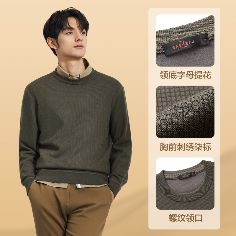 【华夫格加绒】柒牌男士圆领毛衣2025冬季新品休闲保暖舒适针织衫