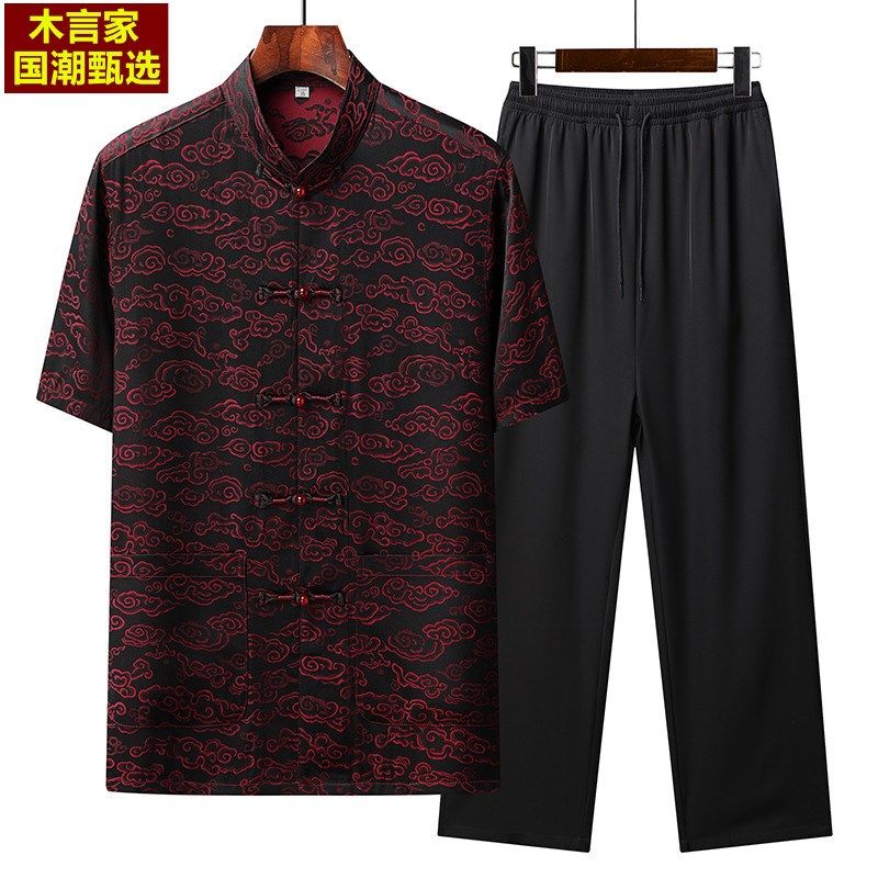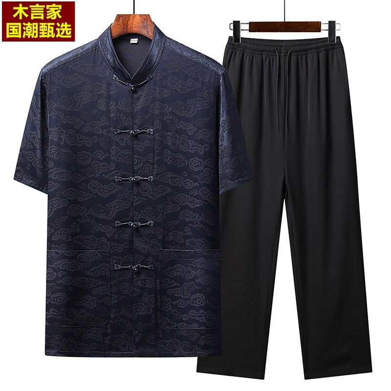 新中式唐装男短袖套装夏季中老年大码蚕丝爸爸装老人生日寿星衣服